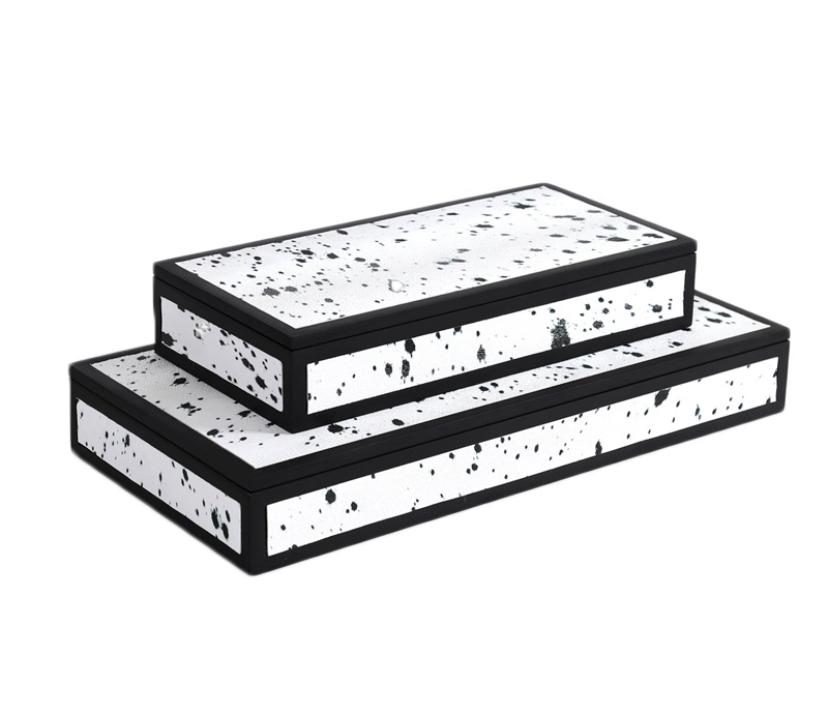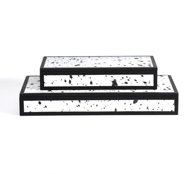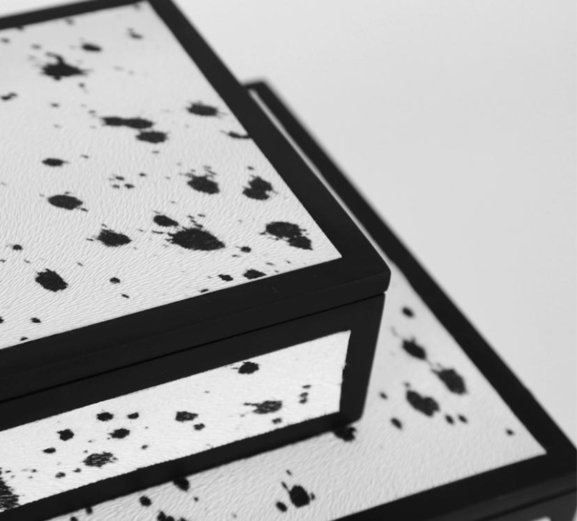 Деревянное основание придает коробкам прочность и надежность. Кожаное покрытие делает их элегантными и стильными. Черно-белая расцветка с кляксами придает им оригинальность и неповторимость. Вместе с тем, черные грани по всему периметру придают коробкам дополнительную прочность и защиту.