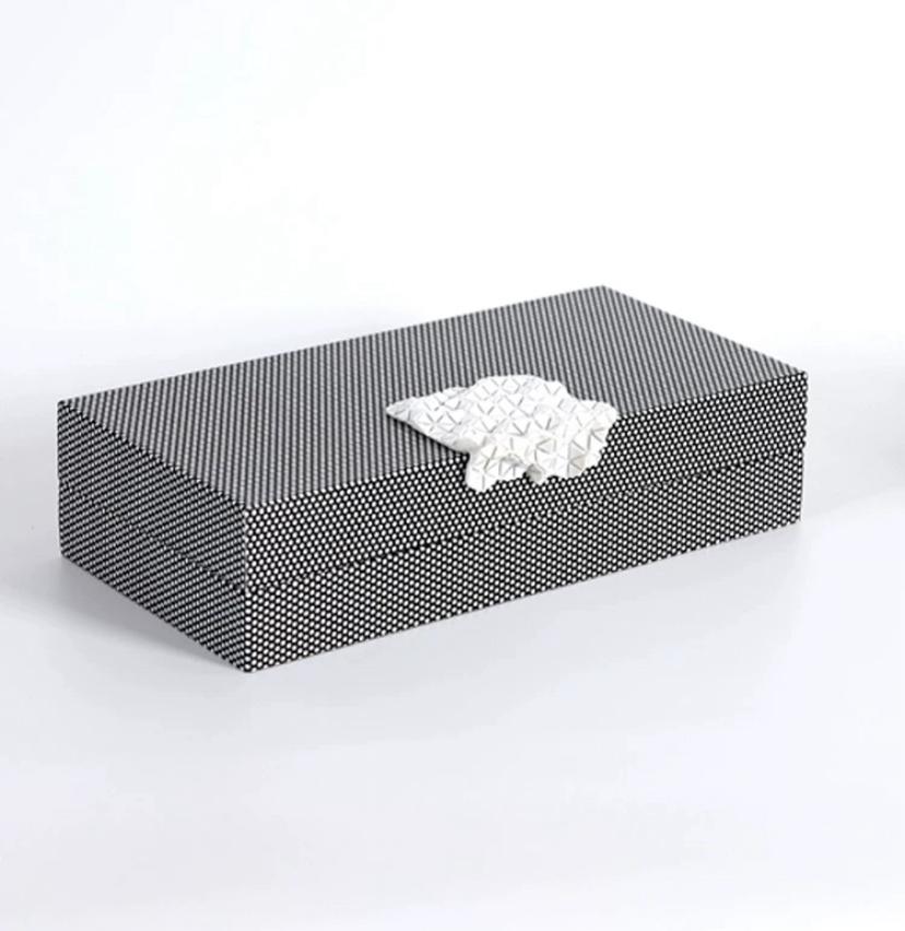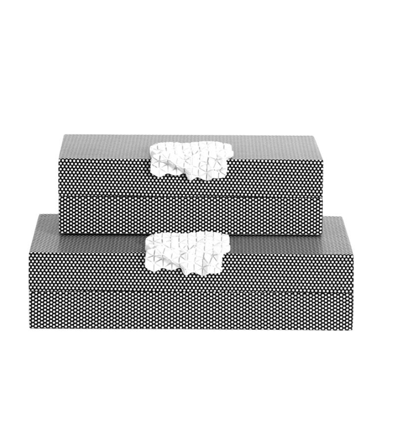 Две небольшие ёмкости для хранения украшений и мелочей, отличающиеся только размером, обладают интересным дизайном в виде платочка на крышечке. Обе коробочки имеют темную окраску с мелким симметрично расположенным горошком.
