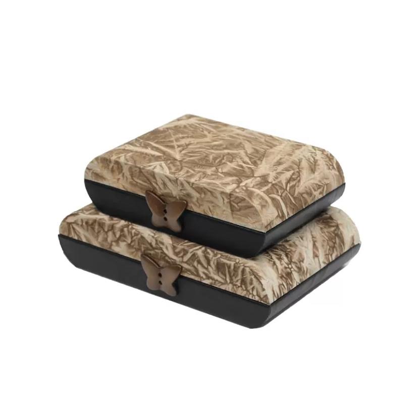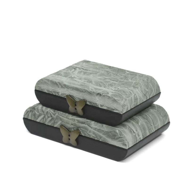 Общей чертой этих изделий, несомненно, является замочек-защелка, выполненный в виде изящной бабочки. Этот небольшой, но стильный элемент конструкции привносит в облик шкатулок нотку игривости и шика. Металлическая бабочка переливается в свете, акцентируя внимание каждого, кто остановит свой взгляд на шкатулках, словно приглашая открыть их и полюбоваться тем, что хранится внутри.
