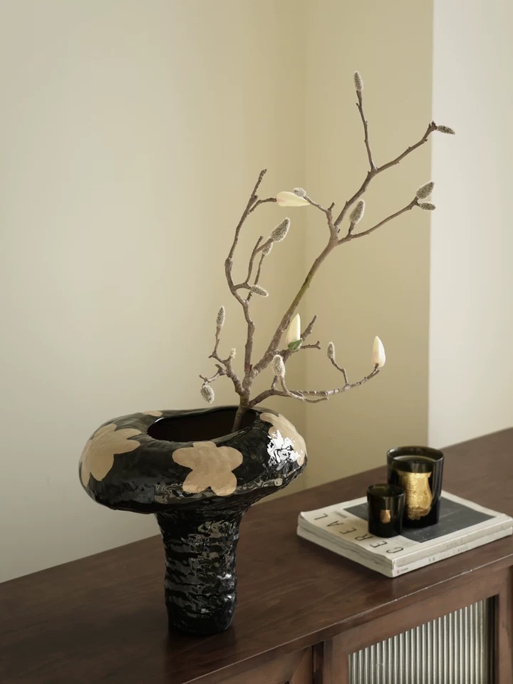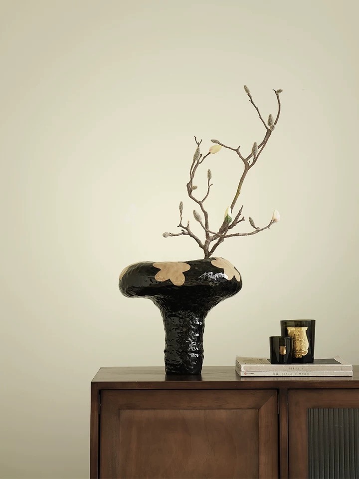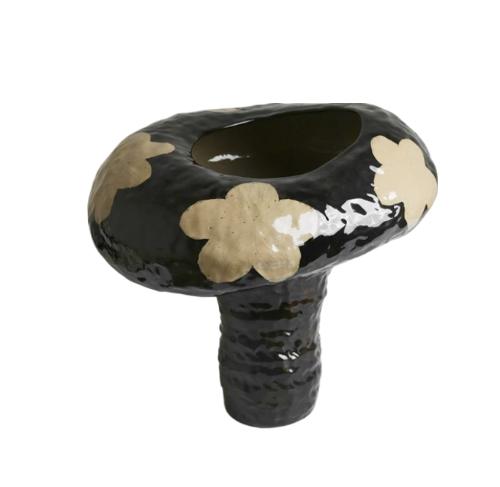 Ваза Black Maffin — которая бросается в глаза своей уникальной и причудливой формой. Эта ваза напоминает гриб волнушку, с утолщением в верхней части и слегка изогнутым, волнистым краем. От ее формы веет природной органичностью, словно ваза взяла себе за основу изящные линии и мягкие изгибы, характерные для своего вдохновителя из леса.