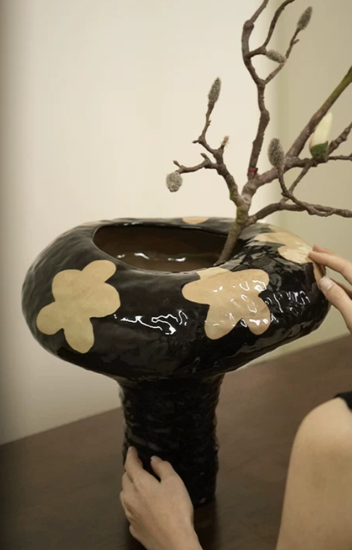 Одним из самых запоминающихся элементов этой дизайнерской вазы являются кофейные цветы, разбросанные по ее поверхности. Цветы выполнены с тщательной детализацией и мастерством, создавая на контрасте со строгим черным фоном теплую и уютную атмосферу. Кофейные цветочные узоры кажутся почти вручную нарисованными и имеют невероятно реалистичную текстуру, словно чудесным образом перенесенные с цветущих растений прямо на керамику. Они словно живут своей жизнью, добавляя вазе неповторимого изящества и смягчая ее монументальную черноту.