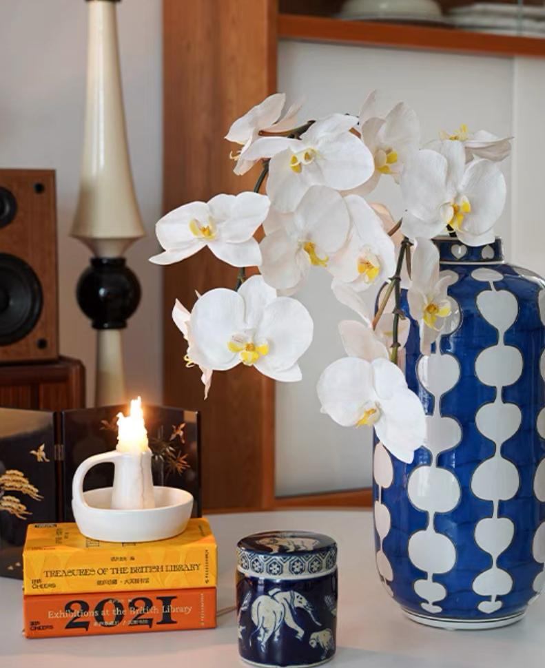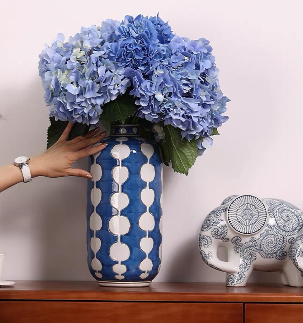 Белый цвет узоров придает вазе нотку нежности и элегантности, подчеркивая её изысканность и утонченность. Сочетание яркого голубого и чистого белого создает визуально привлекательный эффект, который будет гармонично сочетаться с различными стилями интерьера – от современного минимализма до классического или скандинавского.