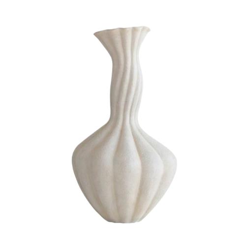 Цвет вазы — матовый светло-бежевый — добавляет ей мягкости и тепла. Обработанная специально таким образом, чтобы избежать блеска, она создает ощущение нежности и спокойствия. Этот светло-бежевый оттенок как будто поглощает окружающий свет, а не отражает его, что придает вазе благородное и сдержанное очарование. Он кажется на первый взгляд простым, но позволяет вазе органично сливаться с разными стилями интерьера, от классики до современности, добавляя уют и утонченность любому пространству.