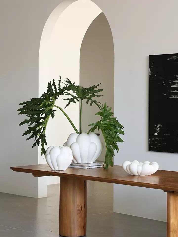 Ее форма трехмерная и округлая, имитируя пушистое облако. Поверхность вазы гладкая, матовая и безупречная, словно она была создана из мягких облаков. Белый цвет вазы придает ей нежность и легкость, сливаясь с окружающей обстановкой.