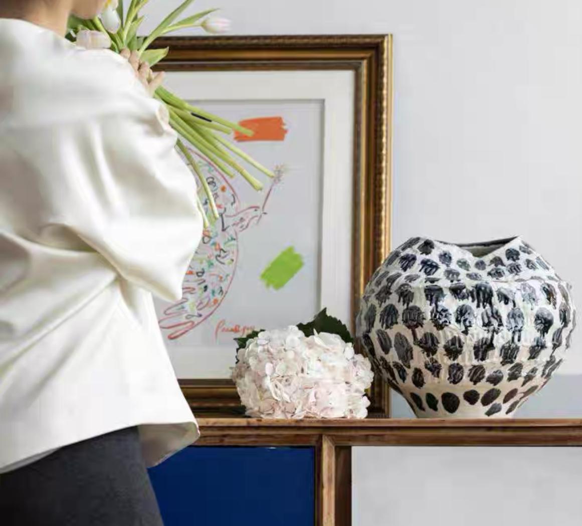 Сама ваза выполнена в светлом цвете, словно полотно, на котором разворачивается живописное действо. Светлый оттенок визуально расширяет пространство, наполняя его светом и воздухом. Он создает нейтральный фон, позволяя синеватым пятнышкам проявиться во всей своей красе.