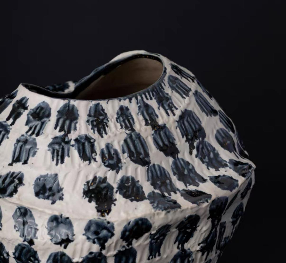 Сочетание светлого фона и синеватых пятнышек создает эффект легкости и воздушности. Ваза словно парит в воздухе, не касаясь земли. Она наполнена энергией и динамикой, притягивая взгляд и вызывая восхищение.