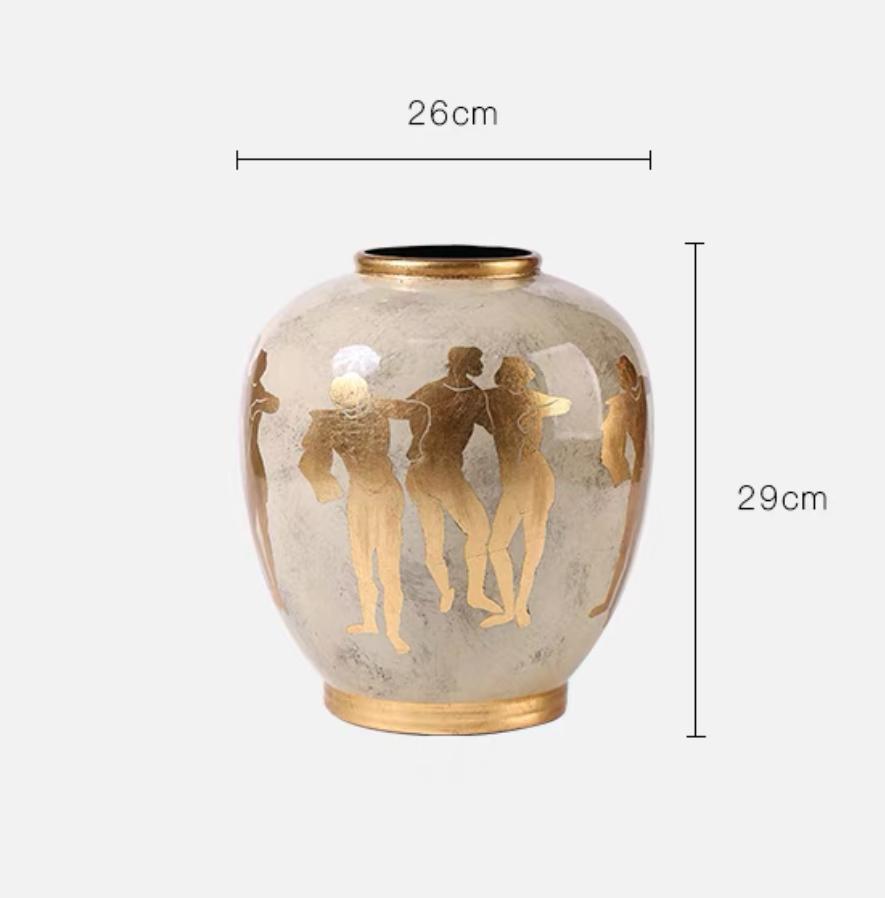 Перед вами предстает ваза, словно сошедшая со страниц древнегреческих мифов, воплощенная в керамике и украшенная роскошью. Округлая форма вазы, подобная амфоре, мягко изгибается, создавая гармоничный силуэт, приятный глазу. Её облик напоминает о временах расцвета эллинской культуры, когда красота и гармония были возведены в культ.