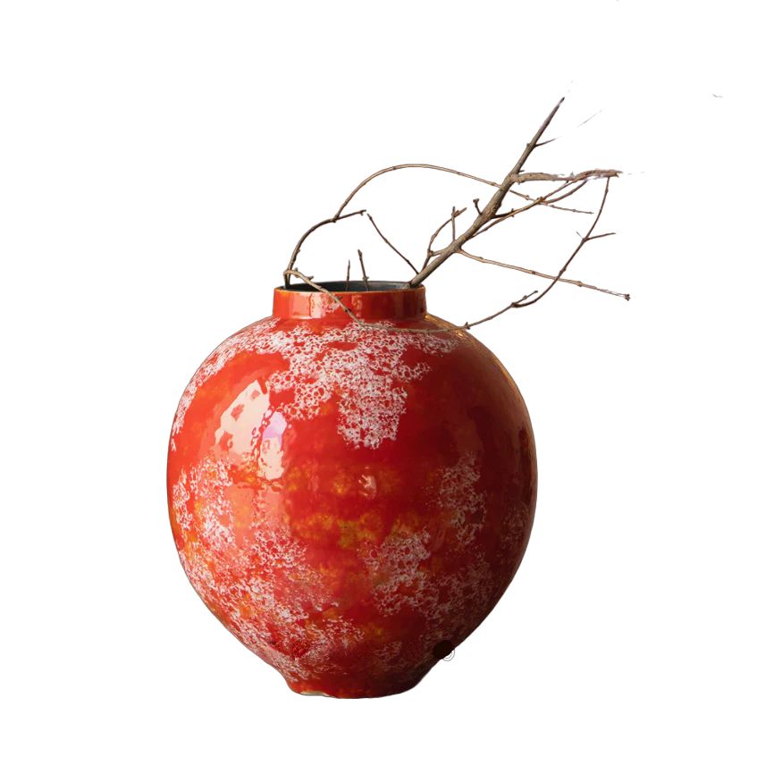 Эта керамическая ваза впечатляет своей красотой и оригинальным дизайном. Она имеет круглую форму, напоминающую ароматную и сочную ранетку, выполнена в ярком красном цвете с глянцем, который привлекает внимание.