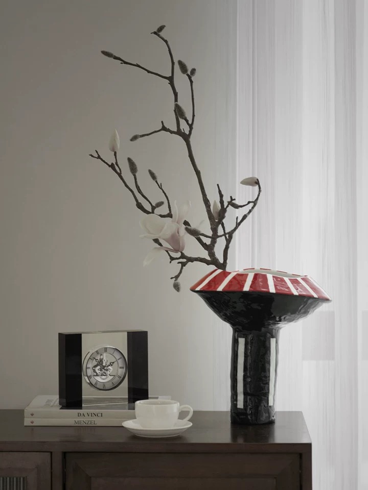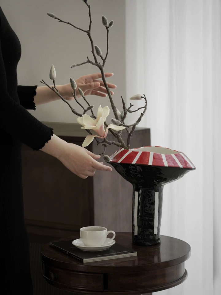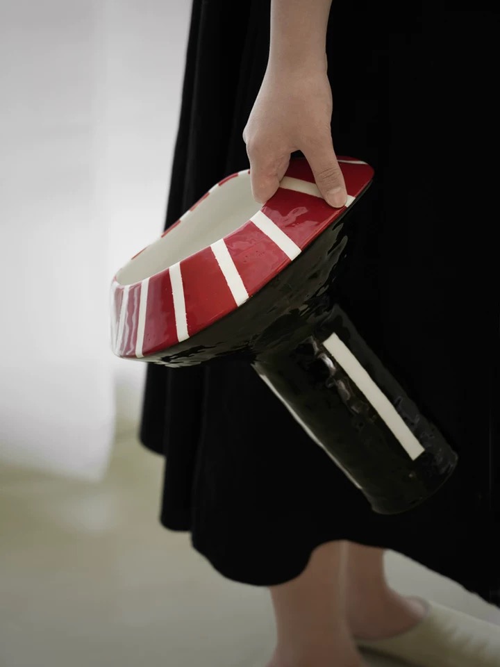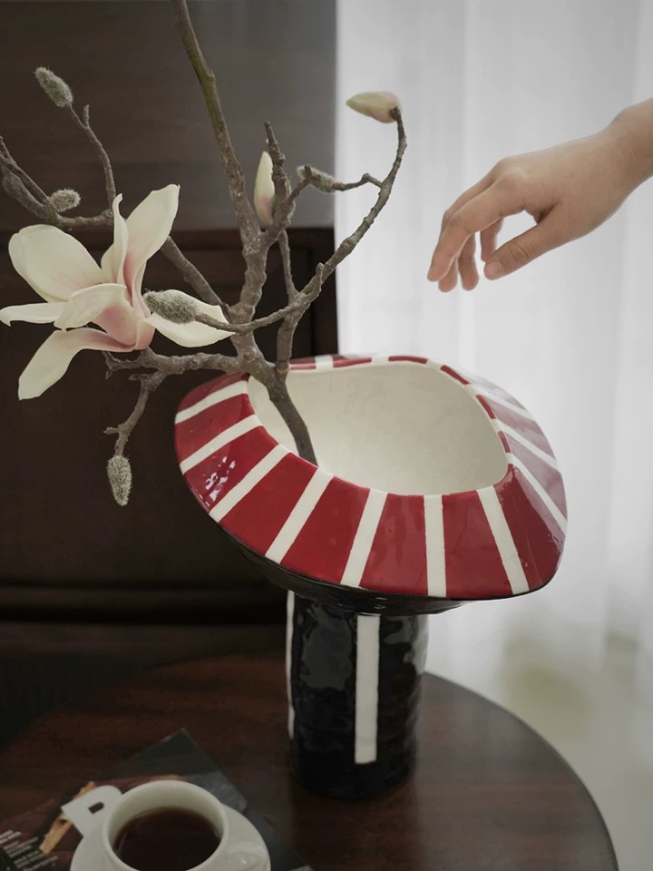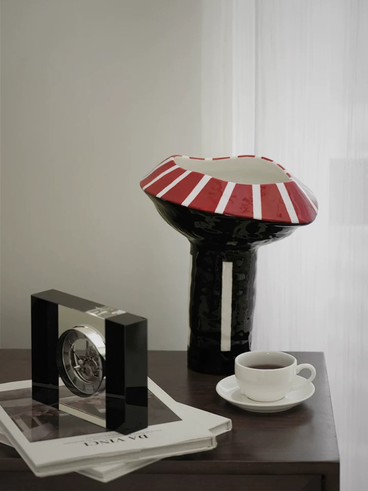 Верхняя часть вазы, находящаяся на черной ножке, выглядит как красная шляпка гриба, украшенная белыми полосками. Это создает контраст и добавляет вазе игривости. Комбинация яркого красного цвета с белыми полосками делает эту вазу по-настоящему привлекательной для глаз.