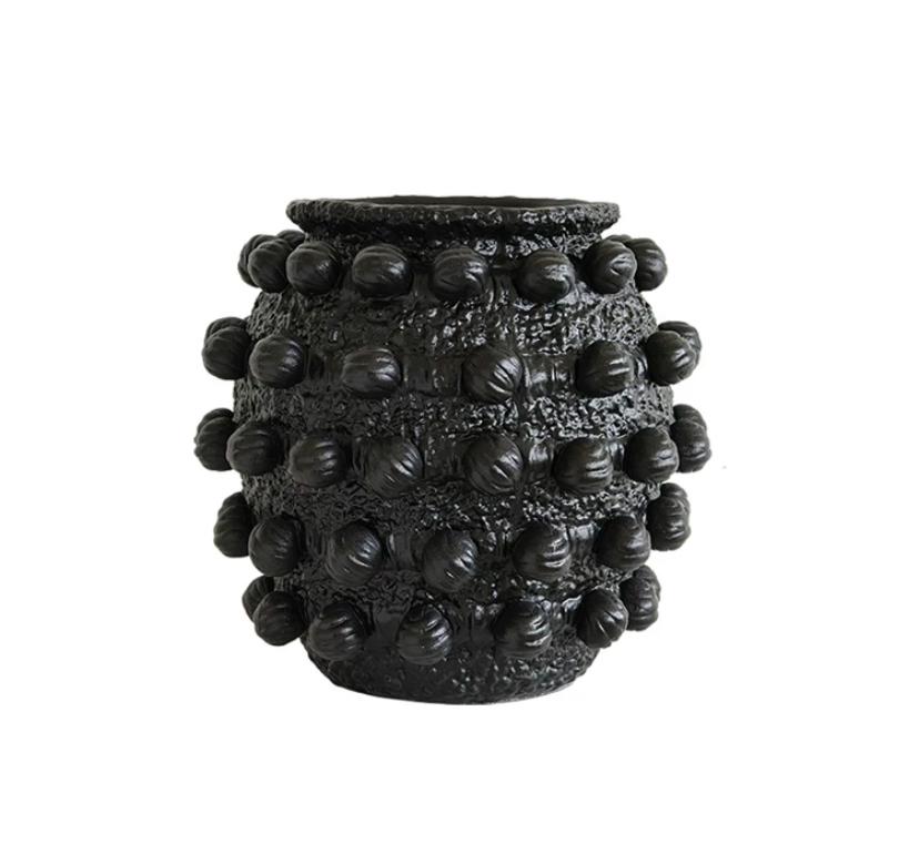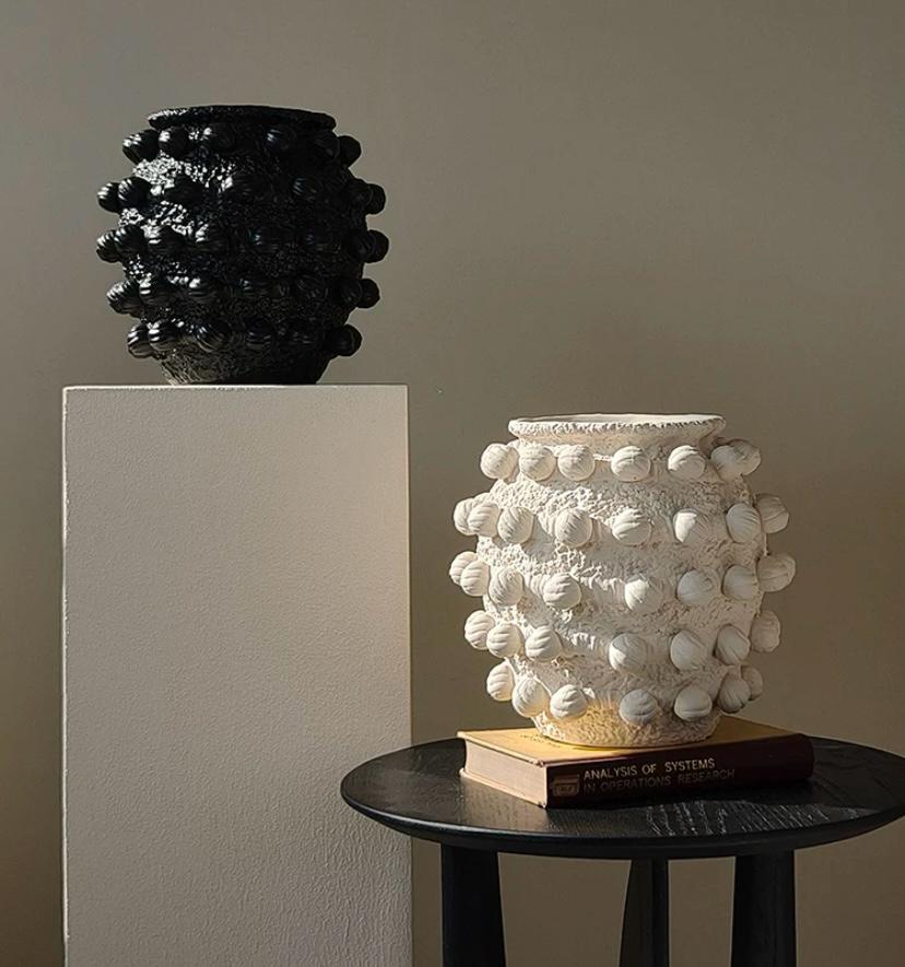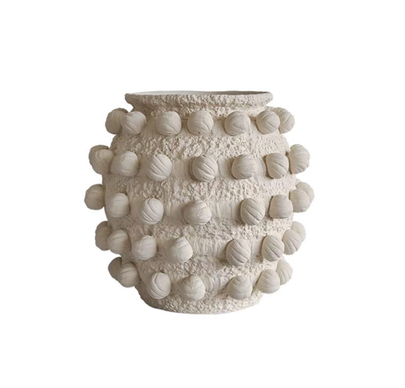 Особую изюминку этой вазе придают небольшие круглые детали, которыми украшена ее поверхность. Эти декоративные элементы, выполненные в бежевом цвете, расположены рядами по окружности вазы, начиная с верхней части и плавно спускаясь вниз. Каждый ряд состоит из идеальных кружочков, которые, словно жемчужины, аккуратно высажены на поверхности. Эти ряды придают вазе необычность и объем, создавая интересную игру света и тени, особенно заметную при различном освещении.
