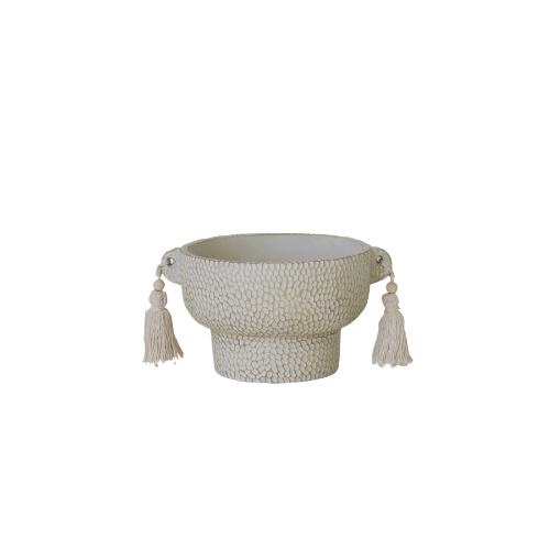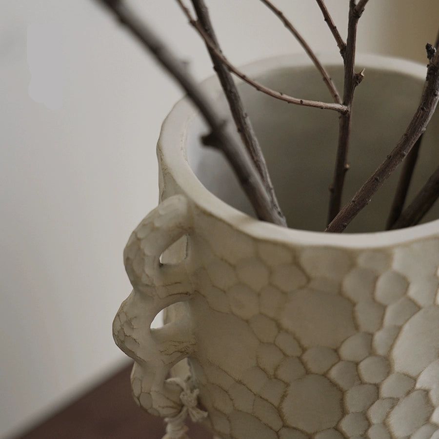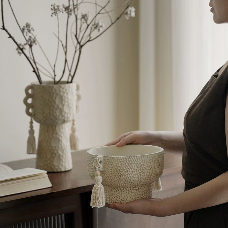 Игривым завершением этого произведения искусства служат милые хлопковые кисточки, свисающие по краям вазы. Они, словно легкие пушинки, добавляют вазе нотку игривости и богемного шика. Эти кисточки, выполненные из натурального хлопка, мягко покачиваются при малейшем движении воздуха, создавая ощущение легкости и воздушности. Их кремовый цвет гармонично сочетается с бежевым оттенком вазы, создавая целостный и завершенный образ.