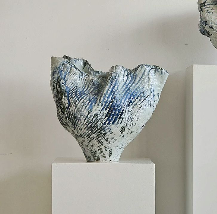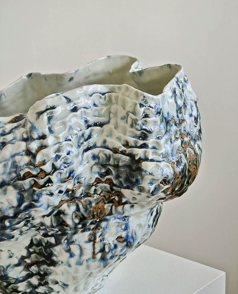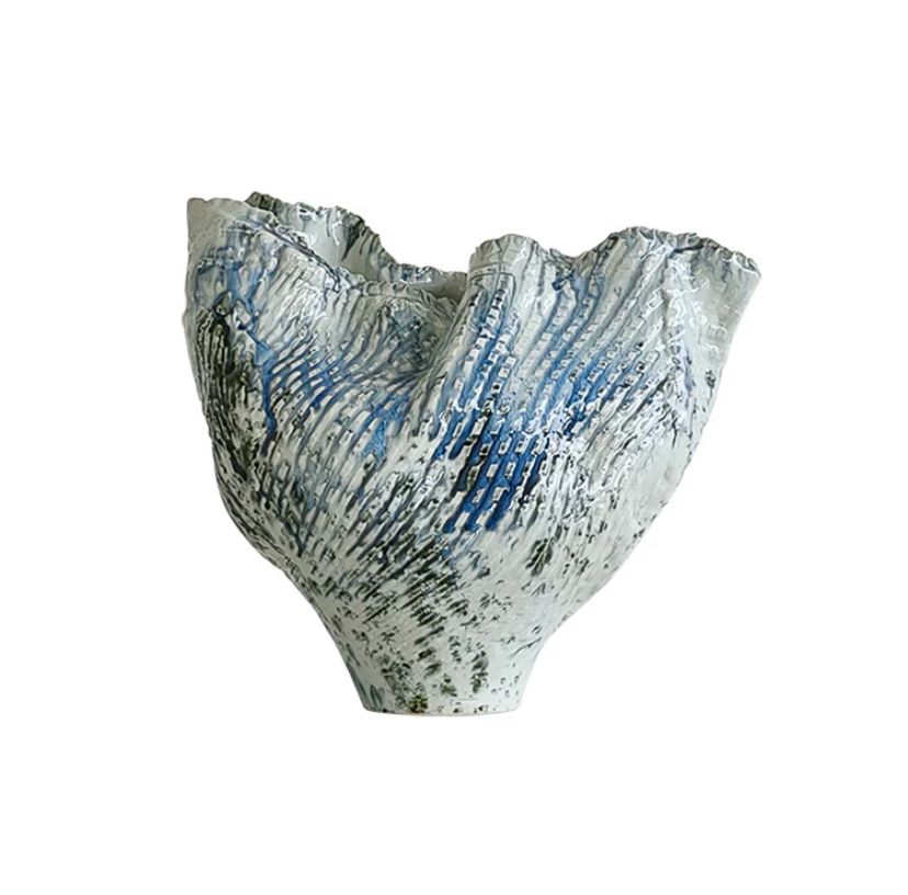Стены вазы не поддаются строгим геометрическим описаниям — то ли вазы, то ли морские кораллы, их изгибы и вмятины кажутся стихийно возникшими, не подвластными человеческой руке. Каждая линия произвольна, но гармонична, словно создана самой природой. У неё практически нет ровных поверхностей, всё кажется живым, текучим, как вода, плавным, как морская волна. То тут, то там, на теле вазы можно заметить наросты и бугры, будто отложения минеральных солей, которые не покидали этот предмет многие годы.