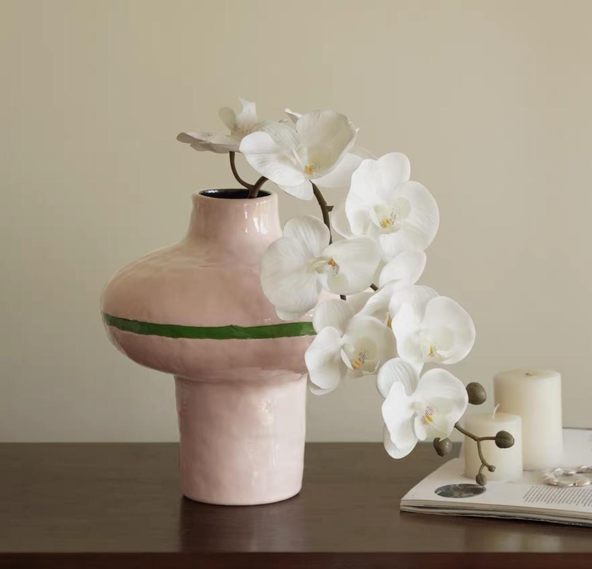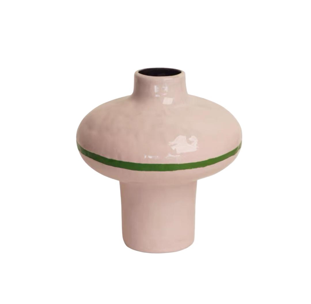 По середине окружности вазы проходит зеленая полоска. Этот акцент добавляет вазе свежести и динамики. Зеленый цвет символизирует природу, жизнь, рост и гармонию. Он прекрасно сочетается с нежно-розовым, создавая весеннее и радостное настроение. Зеленая полоска притягивает взгляд и подчеркивает округлую форму вазы.