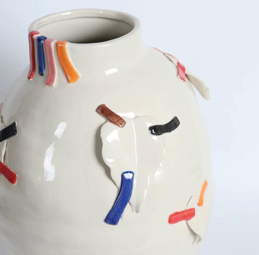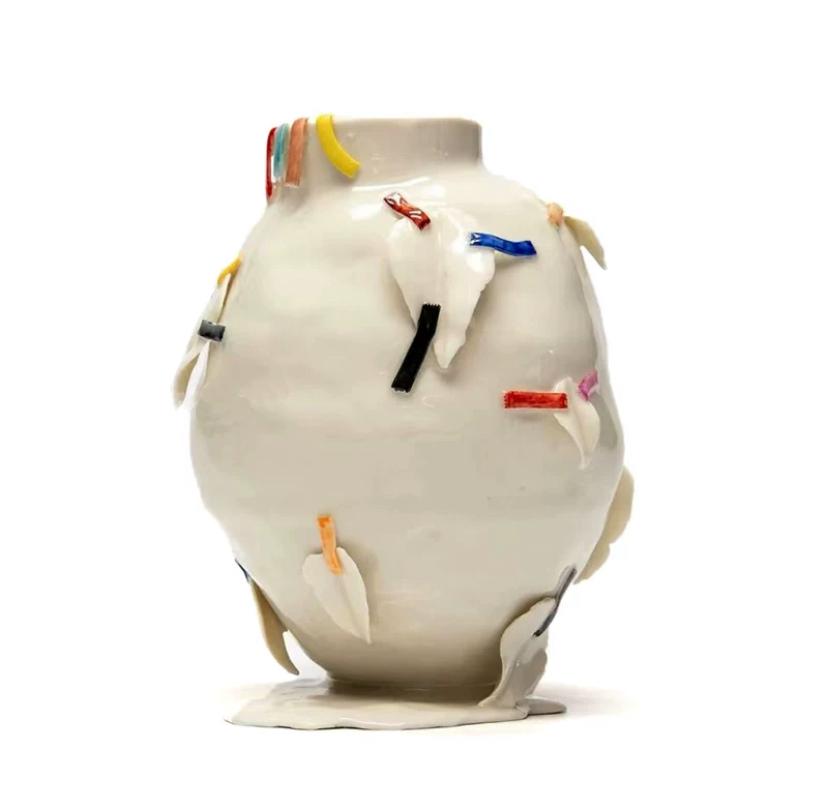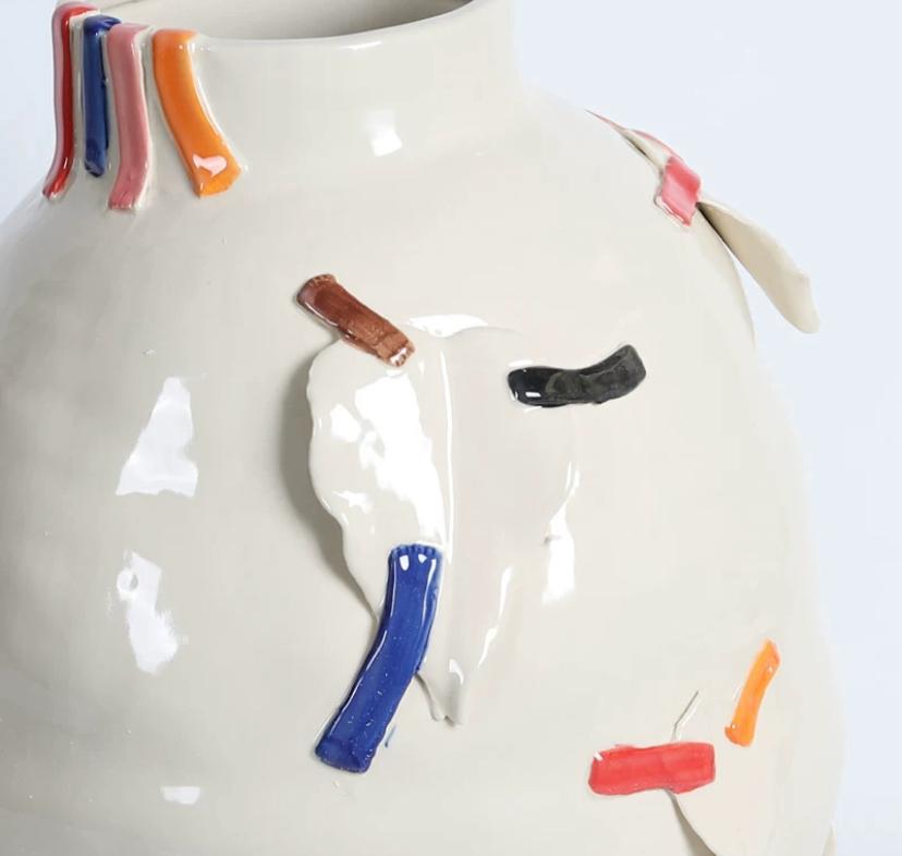 Особенное внимание привлекают хаотично расположенные листики, которыми покрыта ваза. Они выполнены в том же кремовом цвете, но при этом выделяются на фоне своей текстурой и рельефом. Эти листики словно легкая окантовка, добавляют объём и игривость изделию. Наблюдая за их непредсказуемым расположением, кажется, что они были бережно нанесены художником в момент вдохновения, когда каждый жест произрастал из внутреннего импульса творца.