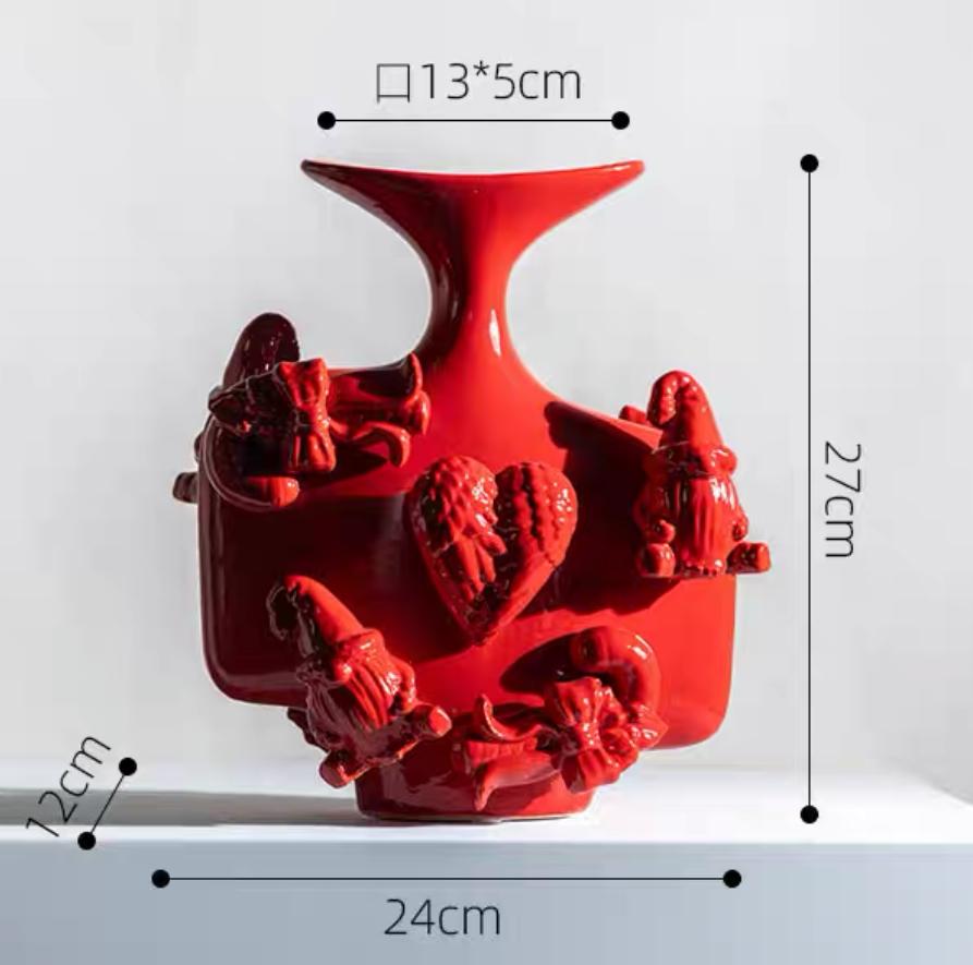 Цвет вазы – насыщенный, глубокий красный, словно кровь дракона или закат над океаном. Этот оттенок притягивает взгляд, согревает душу и наполняет пространство энергией и страстью. Глянцевая поверхность вазы отражает свет, создавая игру бликов, которые подчеркивают ее сложную форму и придают ей еще больше выразительности.