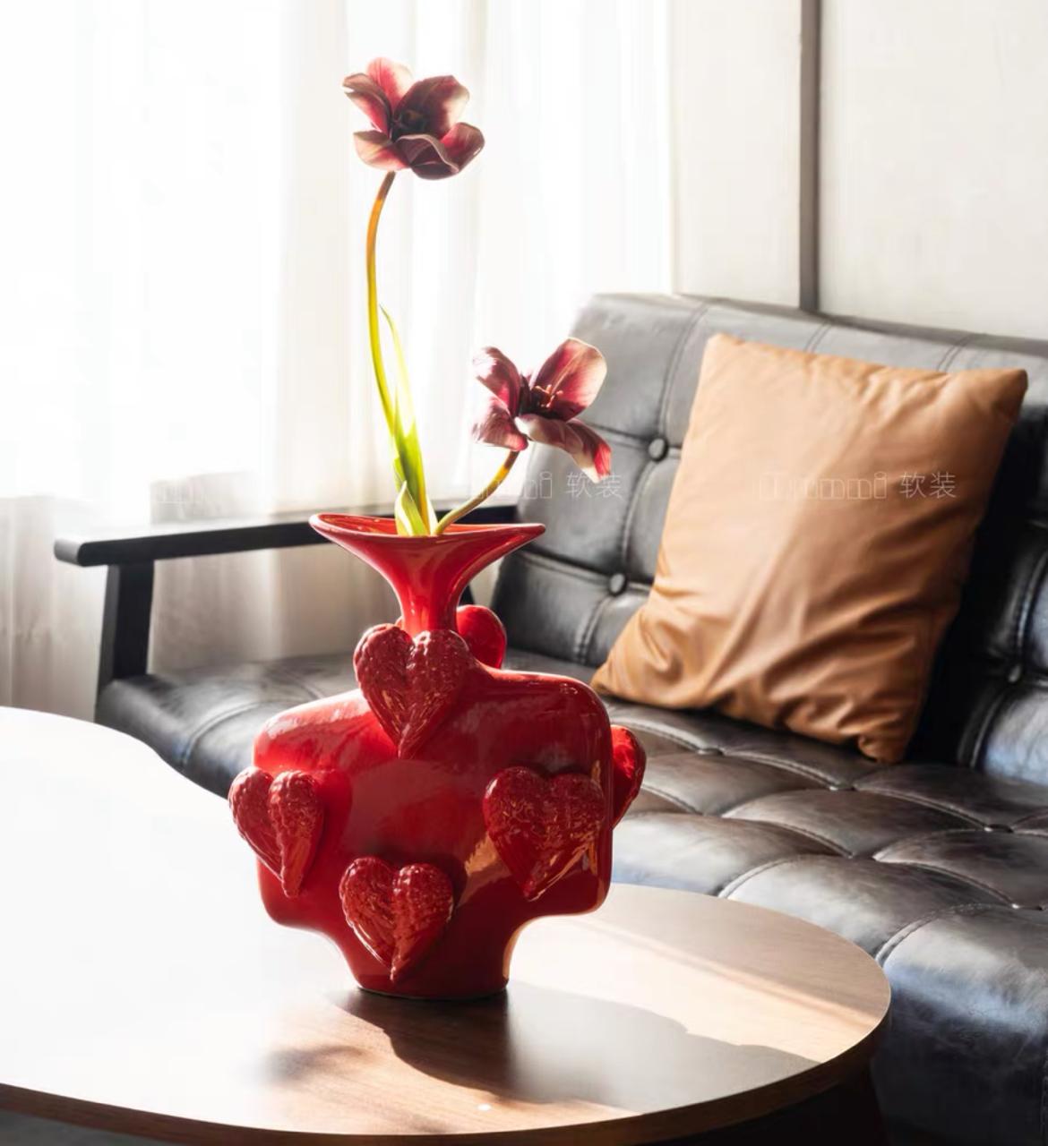 Но самое интересное в этой вазе – ее декор. По всей поверхности вазы, словно маленькие амулеты любви, разбросаны сердечки, также выполненные из керамики. Каждое сердечко отличается от другого по размеру и форме, что лишь подчеркивает их уникальность. Они словно случайно приклеены к вазе, создавая ощущение спонтанности и непринужденности. Сердечки добавляют вазе игривости, нежности и романтического настроения.