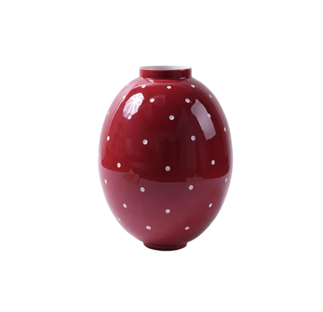 Белый горошек, словно маленькие жемчужины, щедро рассыпан по всей поверхности вазы. Этот рисунок создает ощущение игривости, легкости и беззаботности. Белый цвет горошка контрастирует с красным фоном, что делает его особенно ярким и заметным. Горошек расположен неравномерно, создавая ощущение живого, динамичного рисунка. Кажется, будто он случайно рассыпался по поверхности вазы, придав ей неповторимый шарм.