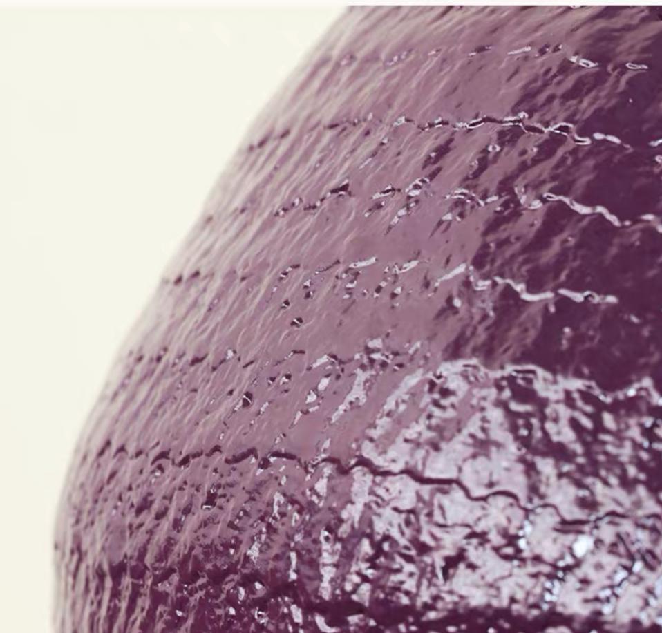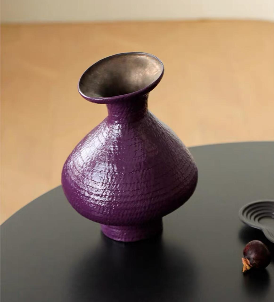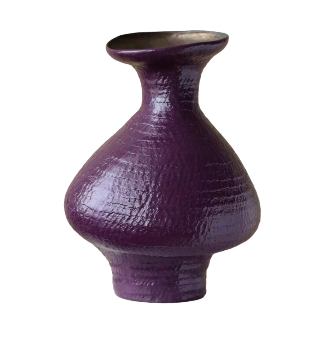 Ваза имеет интересный фиолетовый цвет. Этот таинственный и глубокий цвет придает вазе загадочность и изысканность. В зависимости от освещения, фиолетовый оттенок может меняться, переливаясь от нежного сиреневого до насыщенного баклажанового, что делает вазу еще более привлекательной и интересной.