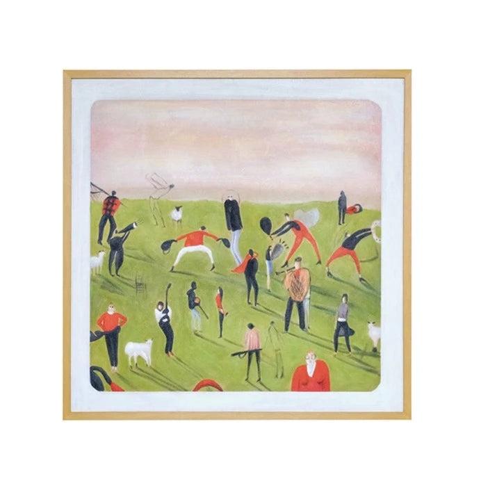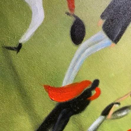 На абстрактном холсте, написанном маслом, представлена картина, изображающая людей и животных, гуляющих в парке на открытом воздухе весной. Цветовая палитра картины преобладает яркими и свежими оттенками зелени, олицетворяющими цветущую природу этого времени года.