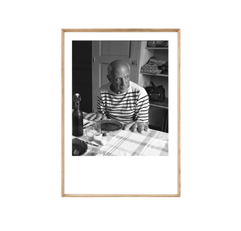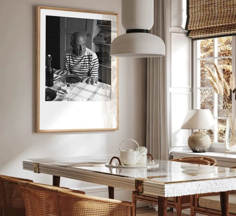 На отпечатанном постере, находящемся в стильной раме, изображен мужчина в возрасте, сидящий за столом в своей домашней столовой. Фотография выполнена в черно-белом стиле, чтобы подчеркнуть ретро-атмосферу и добавить ей некоторую ностальгическую ауру.