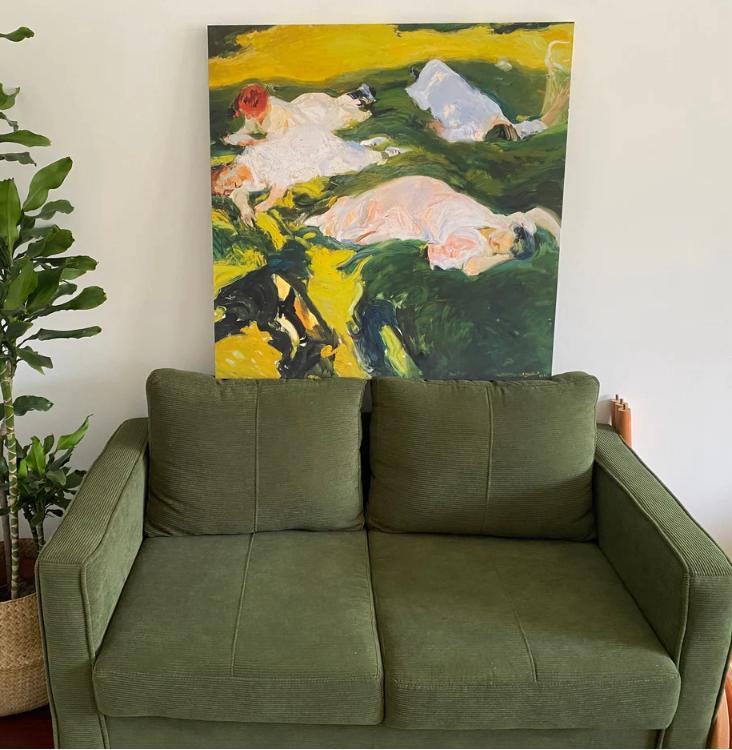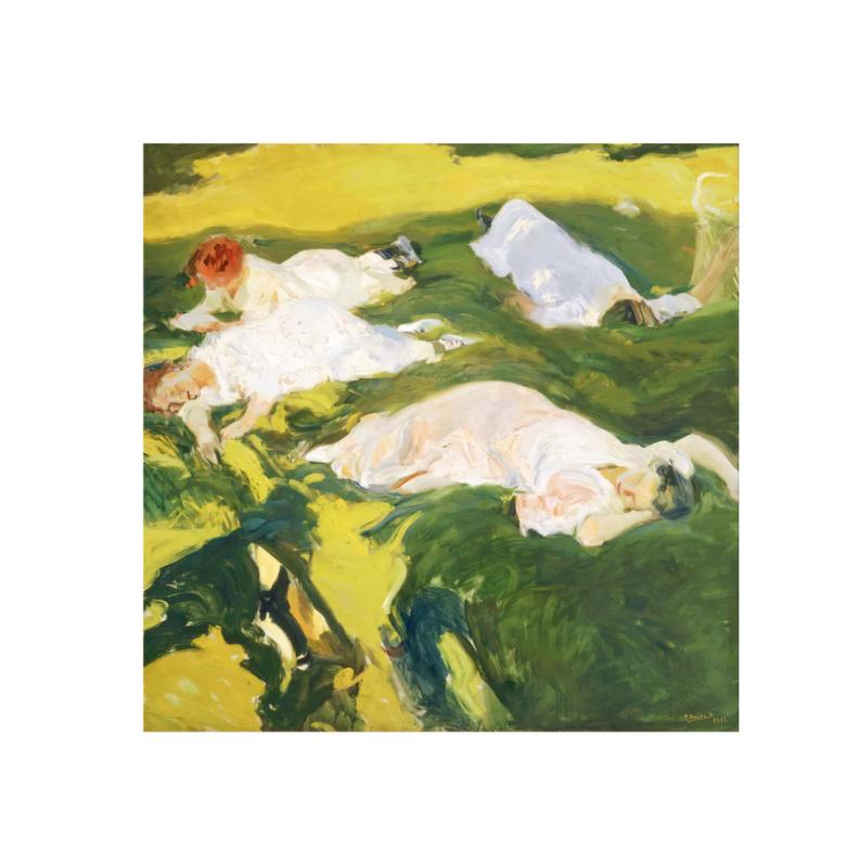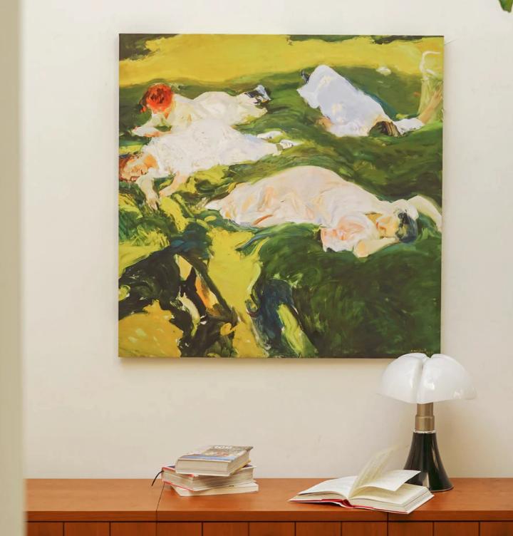 На холсте с печатным принтом изображены четыре молодые девушки, отдыхающие на зеленой лужайке летом. Картина передает атмосферу спокойствия и покоя.