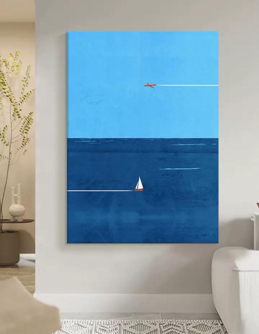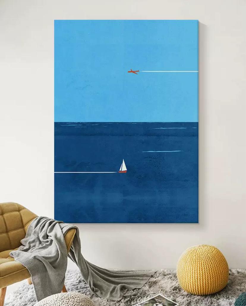 Картина On the Air — Картина выполнена в стиле минимализма и изображает огромное пространство в нем самолет, летящий по небу и оставляющий за собой белоснежный след. Внизу на море можно увидеть парусную лодку, движущуюся во встречном направлении.