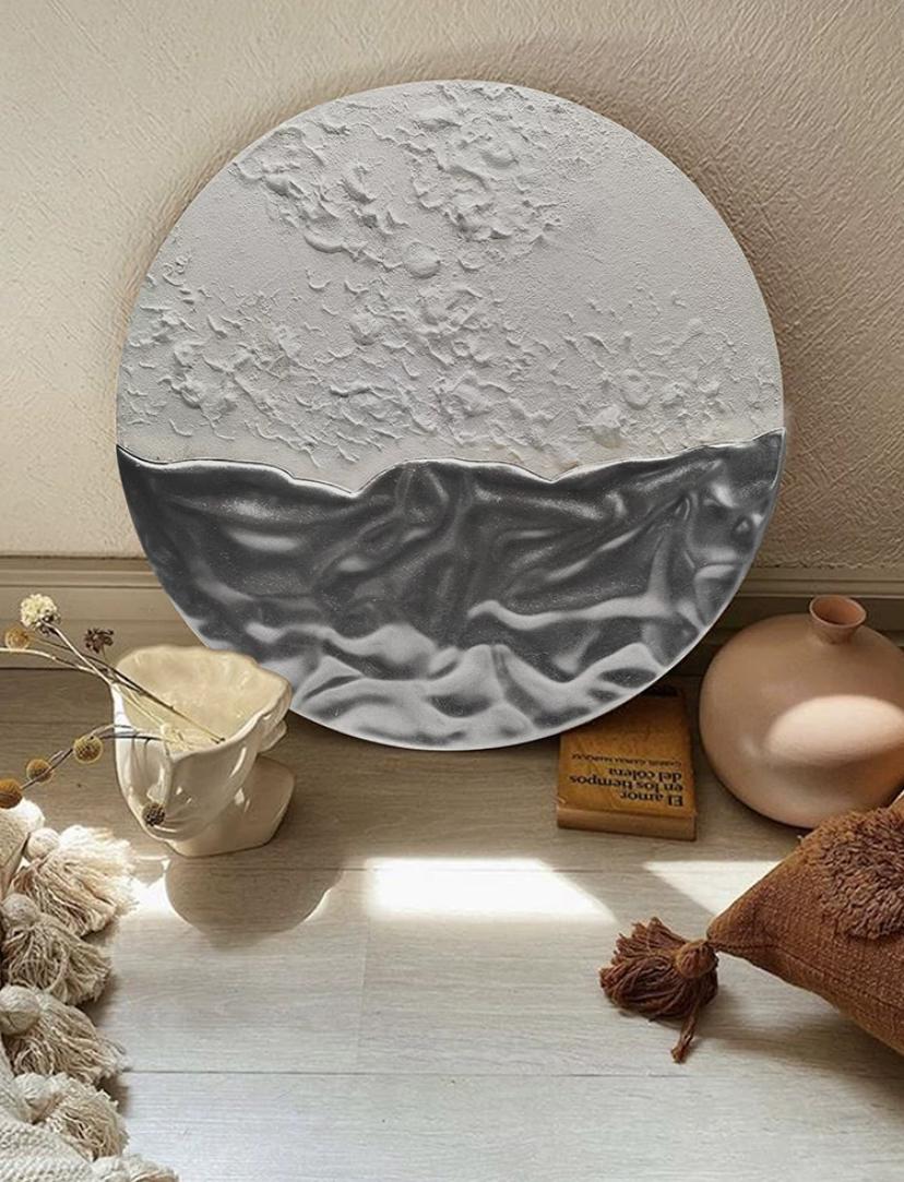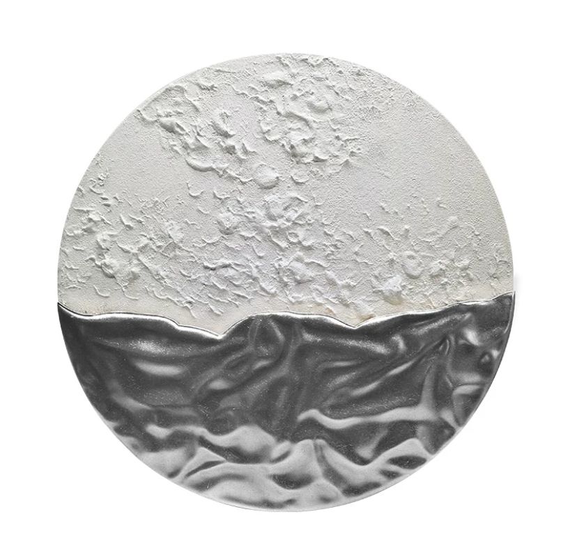 Лунные кратеры и серебряное одеяло….Настенный декор Le Lac Silver от Hpdecor — это работа художника, которая не имеет конкретных изображений или сцен, а вместо этого использованы абстрактные формы, линии, цвета и текстуры для выражения и создания настроения. Картина представляет собой круглую форму, выполненную из белого гипса и серебра (поталь) Ее поверхность гладкая и матовая, создавая эффект мягкости и нежности.
