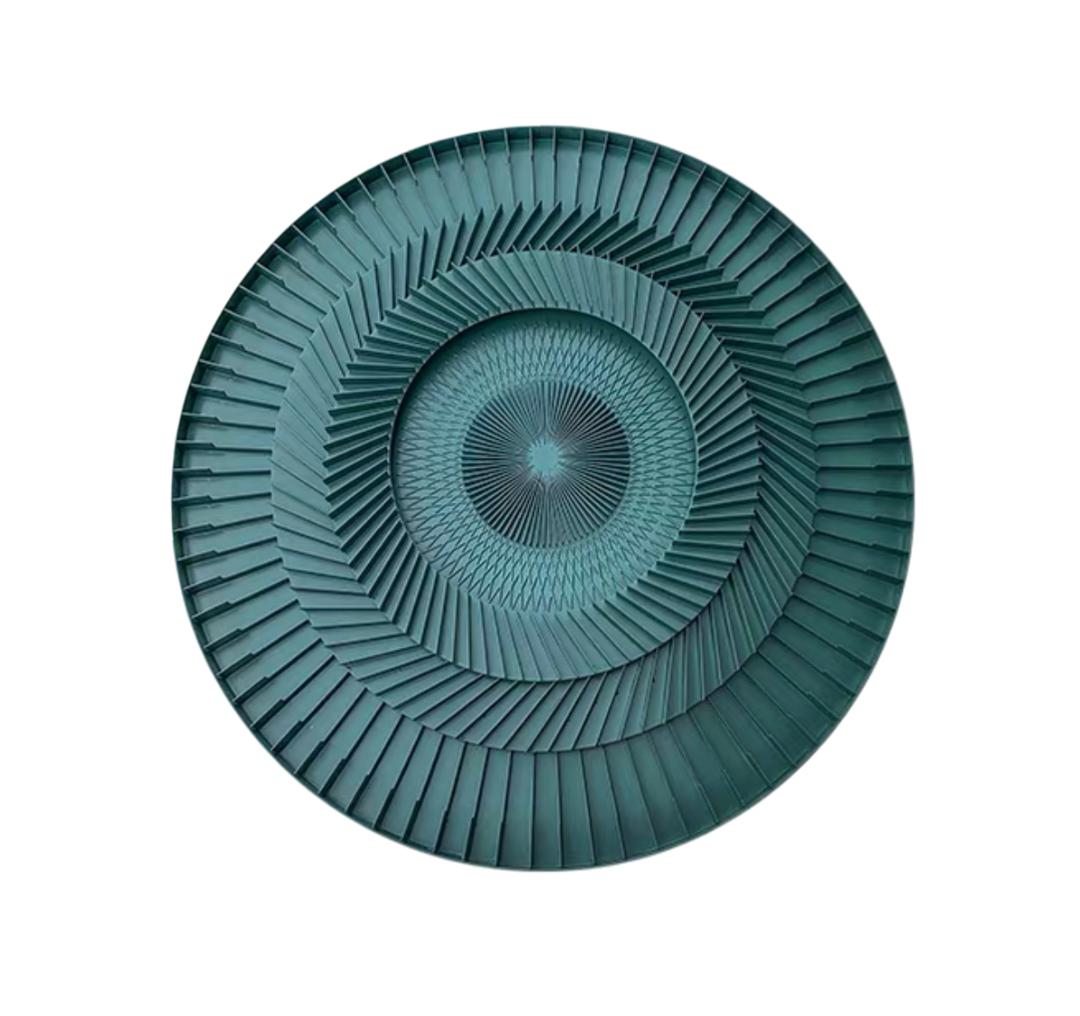 Вся поверхность круга покрыта декоративными узорами, выполненными в виде небольших пластинок. Эти пластинки, разного размера и фактуры, наложены друг на друга, создавая сложную, многослойную композицию. Они могут быть выполнены из металла с мерцающим эффектом, керамики с неровной, будто лунной поверхностью, или дерева, обработанного таким образом, чтобы напоминать окаменелости далеких планет.