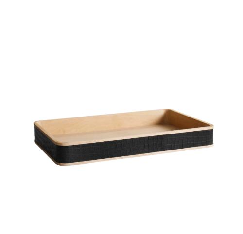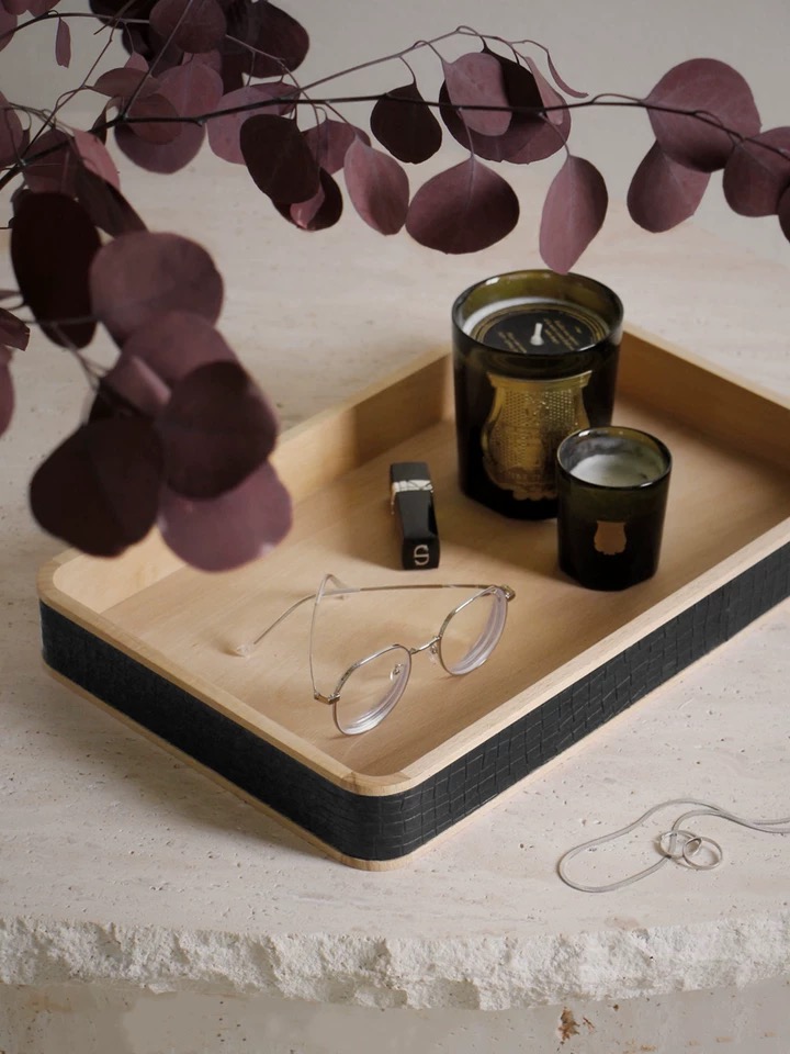 Поднос Dandy, выполненный из дерева с высокими бортиками по всему периметру и краями, обтянутыми черной эко-кожей, представляет собой элегантный и практичный предмет интерьера.