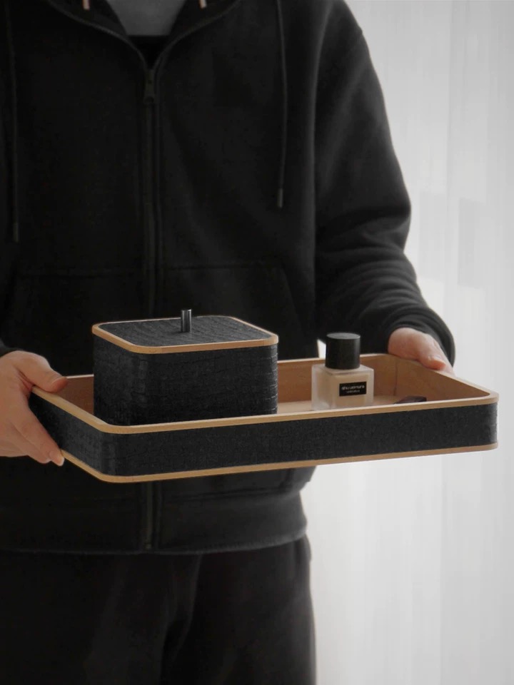 Черная эко-кожа, обтягивающая края подноса, придает ему стильный и современный вид. Этот материал является экологически безопасной альтернативой настоящей коже и обладает схожей высокой прочностью и износостойкостью. Он также легок в уходе и не требует особых усилий при очистке.