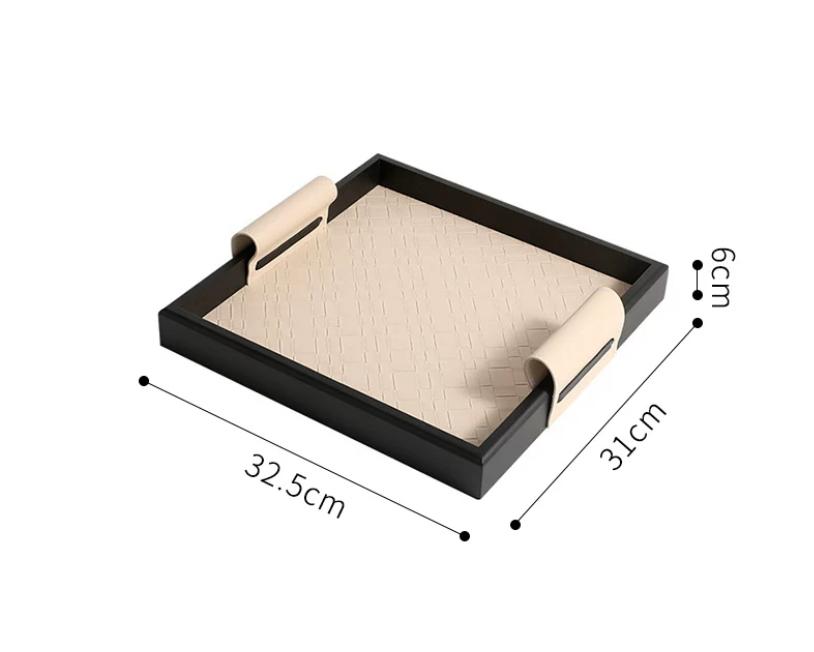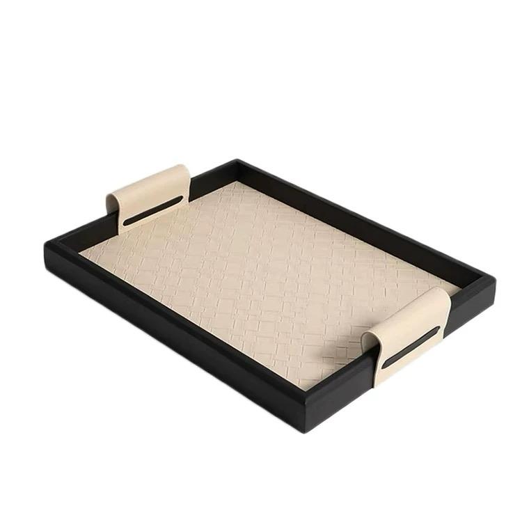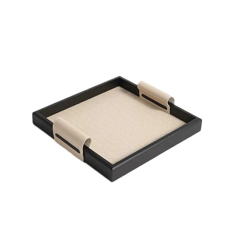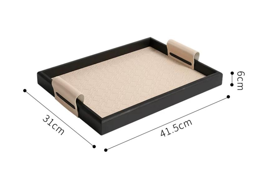 Внешняя сторона подноса обтянута кожей, которая имеет приятный бежевый оттенок. Бортики подноса выполнены в черном цвете, создавая контраст и придавая ему стильный и элегантный вид. Это придаёт подносу единообразный и сдержанный вид.