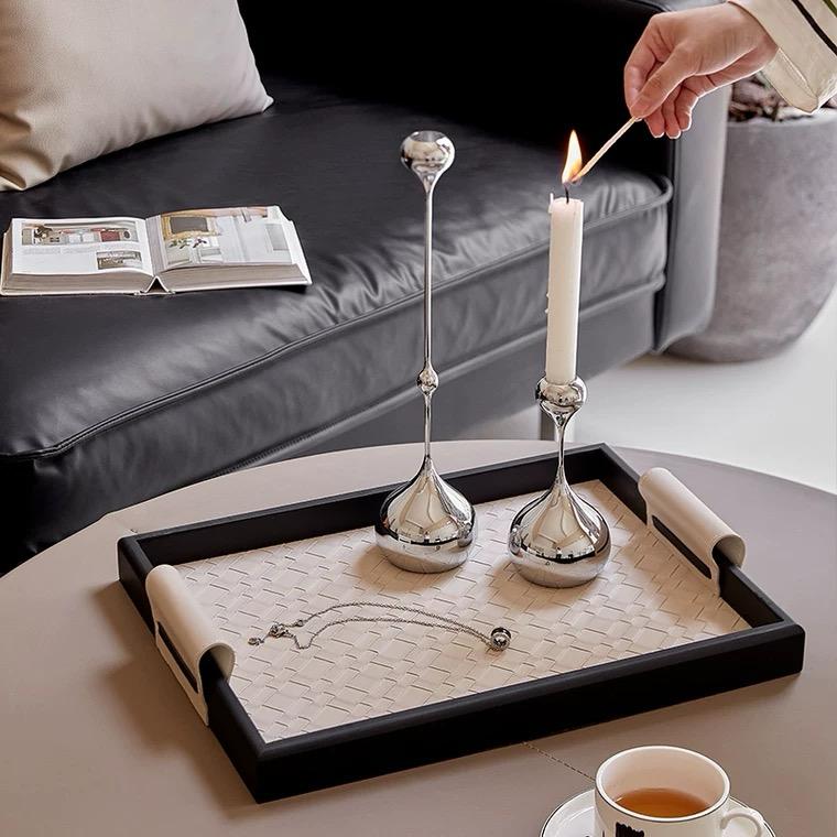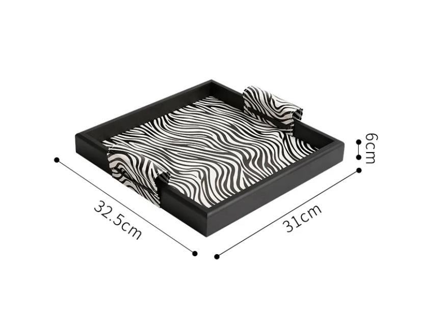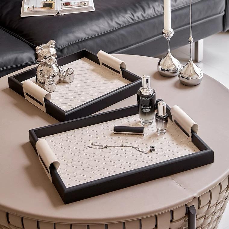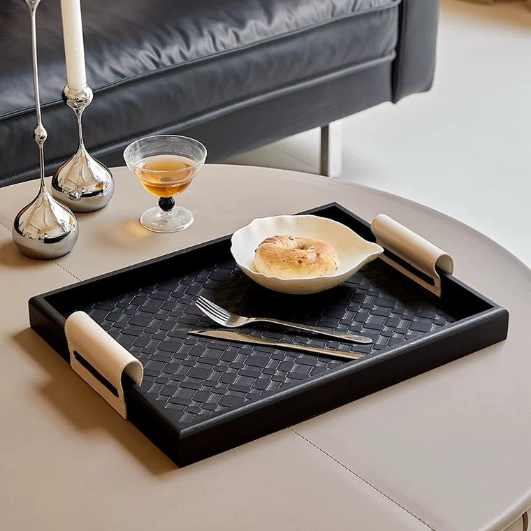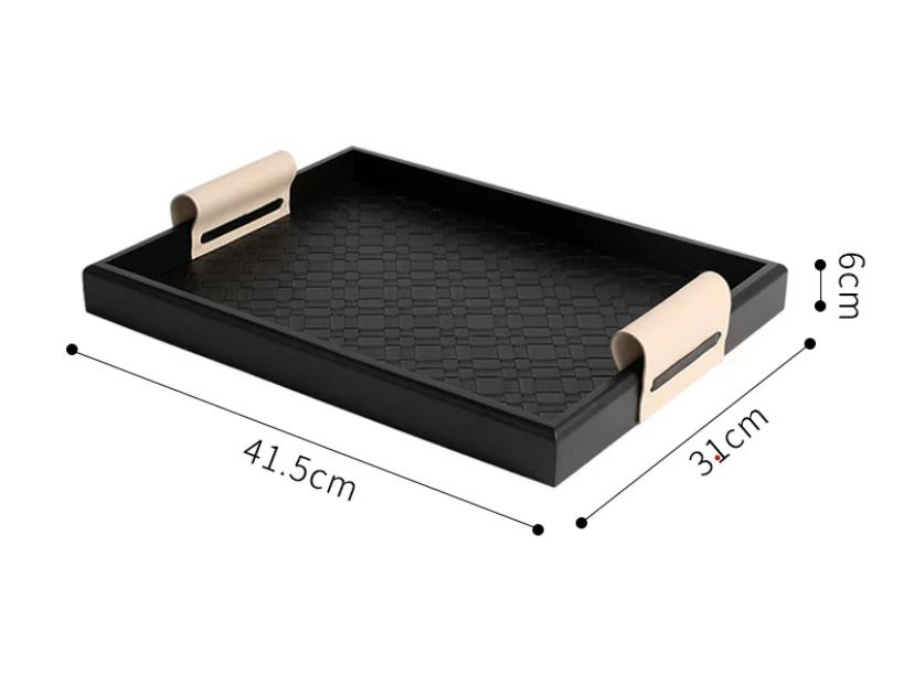На краях бортиков подноса расположены кожаные ручки, которые соответствуют оттенку бежевого дна. Это позволяет комфортно держать и переносить поднос, а также добавляет некую деликатность и художественность в общем восприятии.
