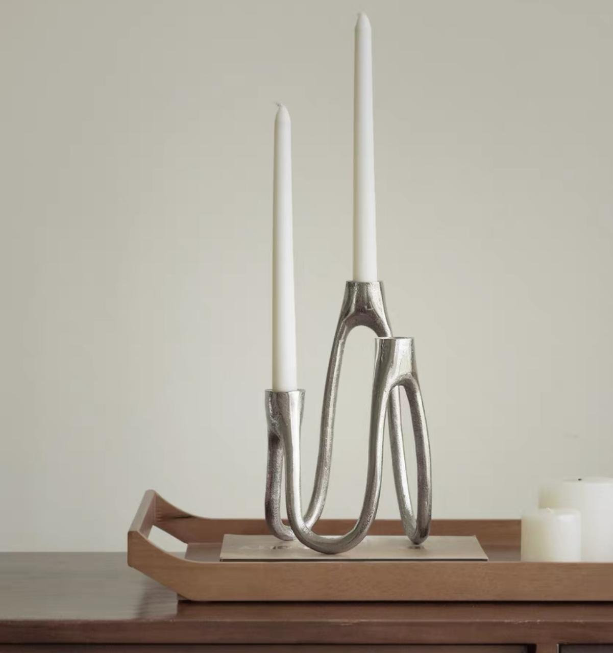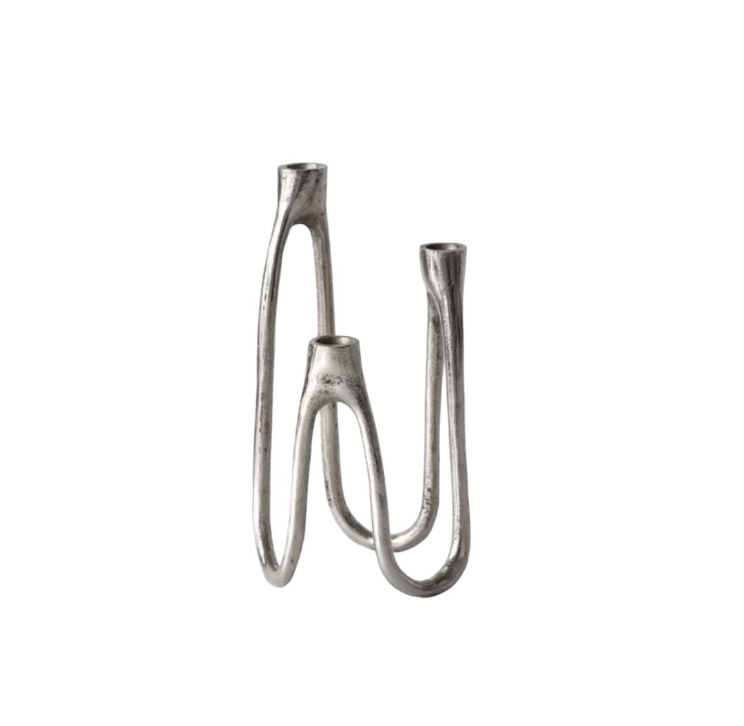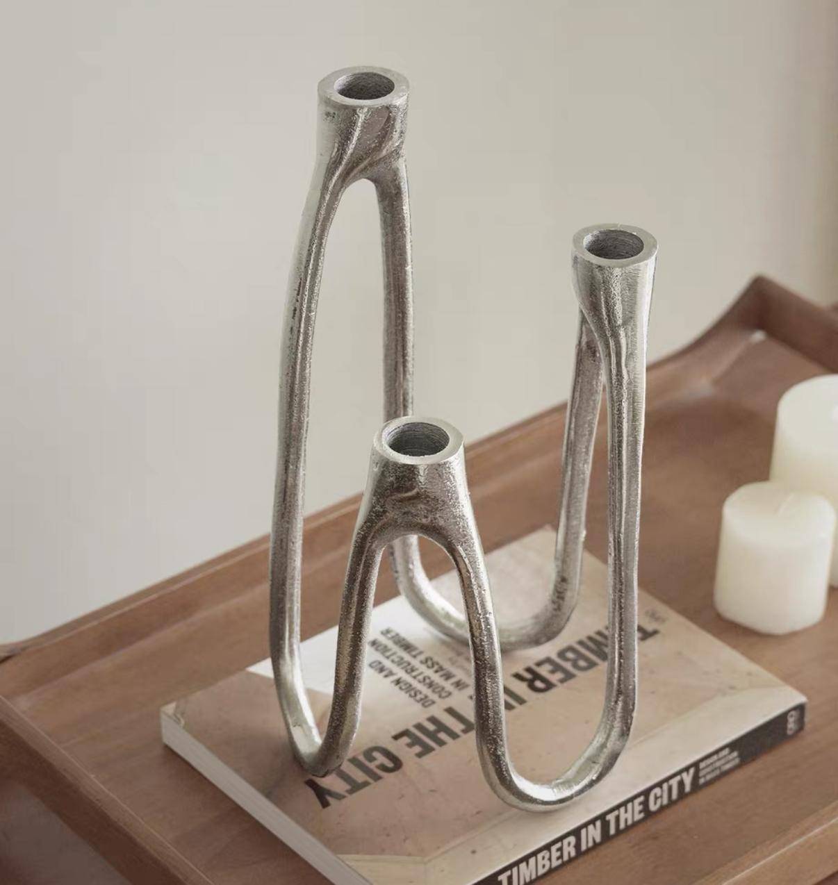 Silver Trio — дизайнерский подсвечник ручной работы, излучающий загадочное мерцание и винтажную элегантность. Этот уникальный предмет интерьера – настоящее произведение искусства, объединяющее в себе изысканный металл, сияющий хром и легкий налет старины.