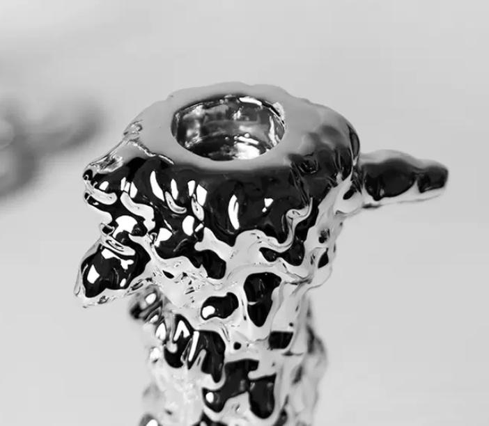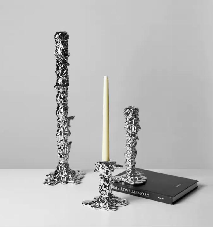 Подсвечник Thaw дизайнерский подсвечник, выполненный из смолы и окрашенный хромированной краской серебряного цвета, имеет уникальную форму, воссоздающую образ расплавленной свечи.