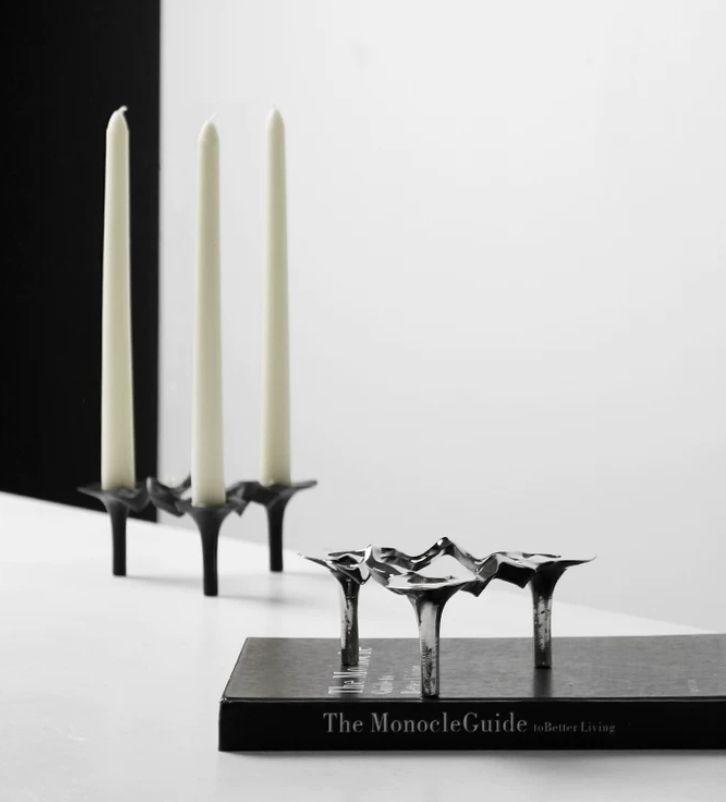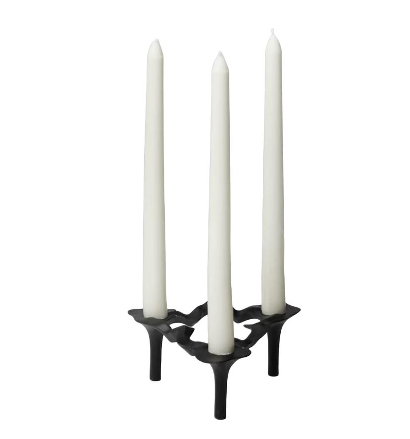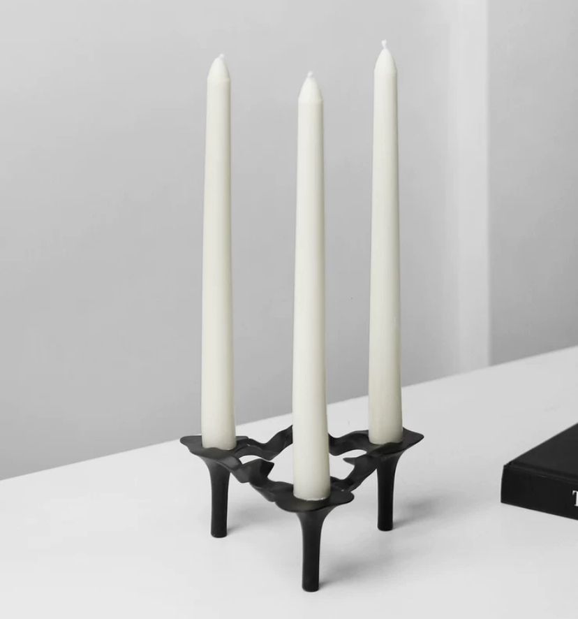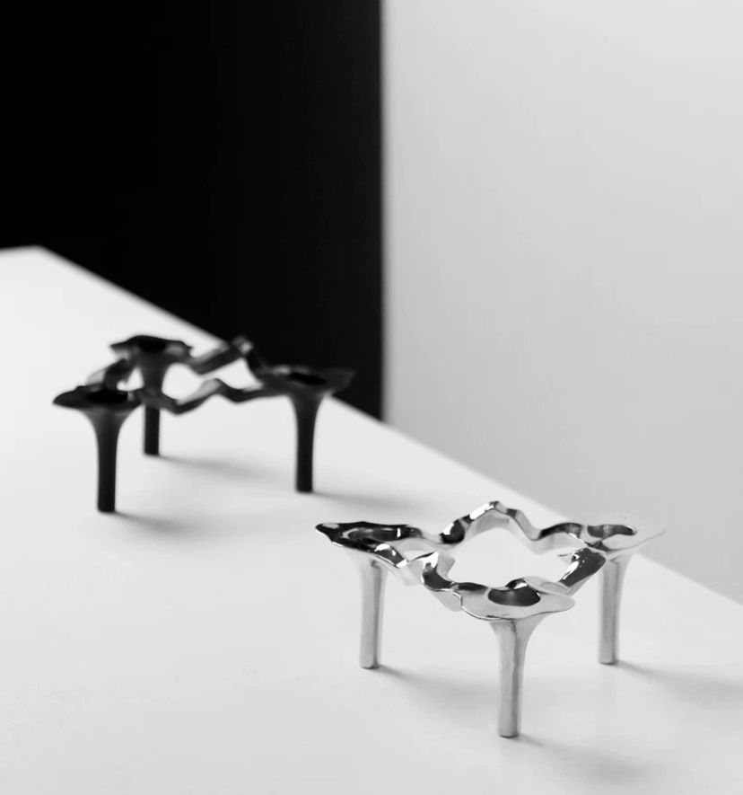 Подсвечник имеет три держателя для свечей, которые следуют симметричной форме, создавая динамичный и нестандартный внешний вид. Изгибы и геометрические фигуры характерны для этого дизайна, добавляя уникальности и загадочности в его общую эстетику.
