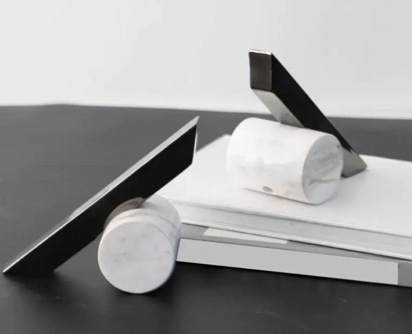 Подставка для книг Fonda представляет собой симметричную конструкцию, состоящую из двух одинаковых держателей. Каждый держатель имеет каменное основание в форме цилиндра, выполненное из искусственного мрамора. Каменное основание обеспечивает прочность и устойчивость подставки.