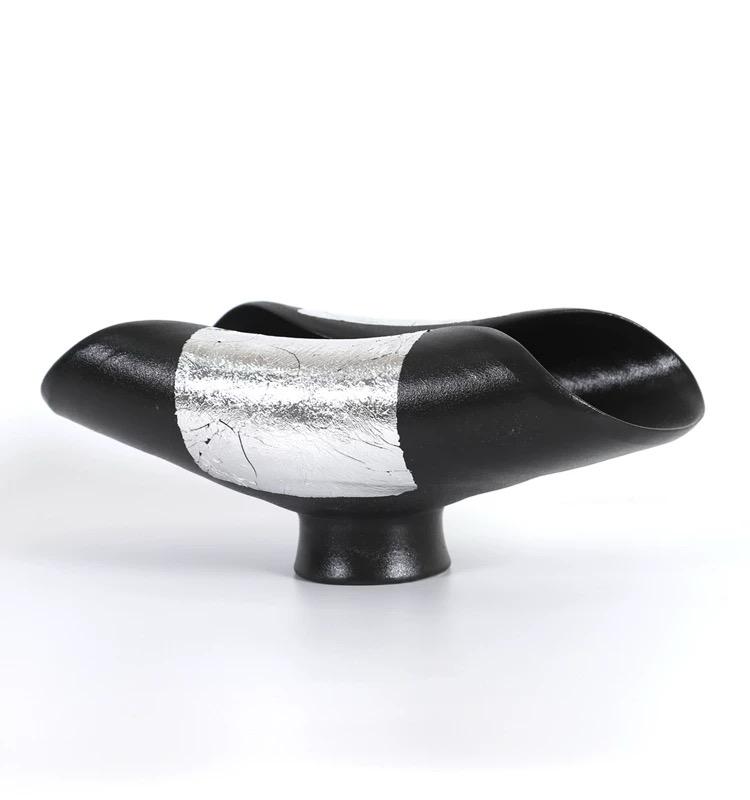 Особенностью этого предмета декора является нанесение потали серебряного цвета на двух изгибах симметрично. Поталь создает блестящий и металлический оттенок, который прекрасно контрастирует с черным цветом смолы. Это придает вазе ощущение современности и стильности.