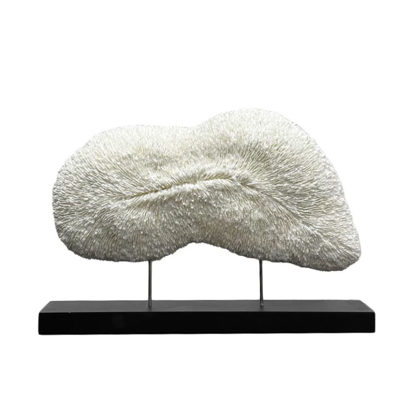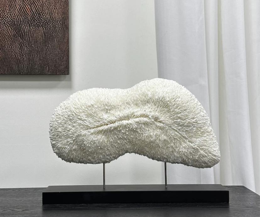 Пористая поверхность коралла, выполненная в шикарно белом цвете, напоминает о морских глубинах. Белоснежный оттенок не только освежает интерьер, но и придаёт чувству спокойствия и чистоты. Эта поверхность пронизана множеством естественных нюансов — от глубоких трещин до изящных гребней, что создаёт эффект игры света и тени, благодаря чему этот коралл будто оживает, когда лучи падают на его поверхность.