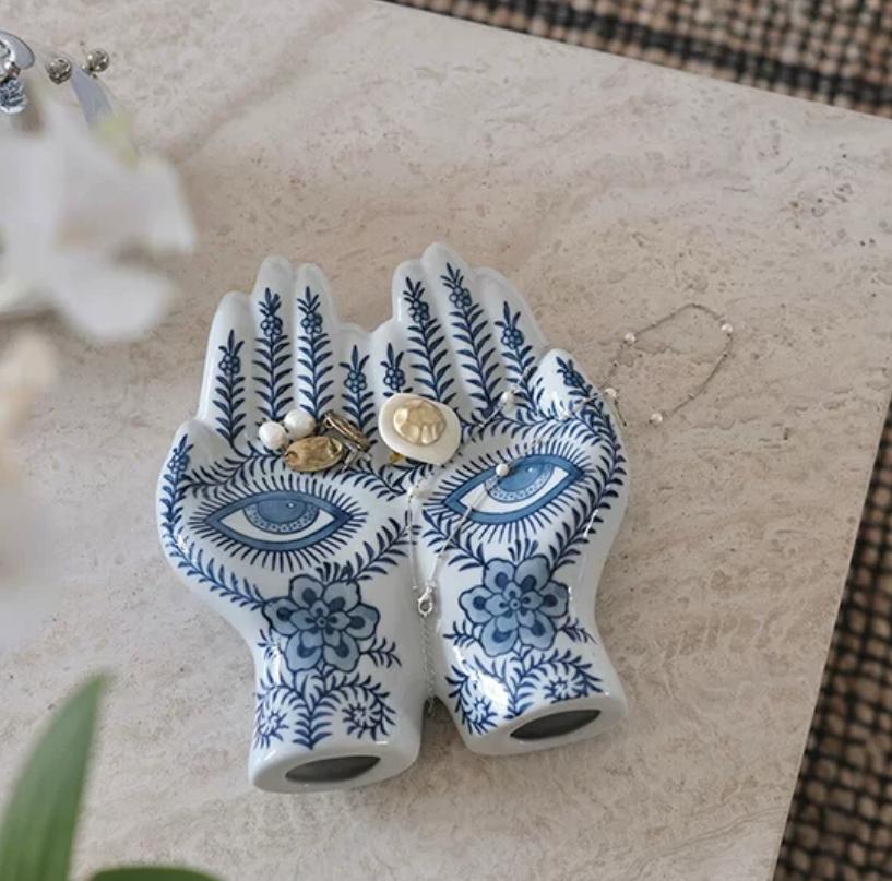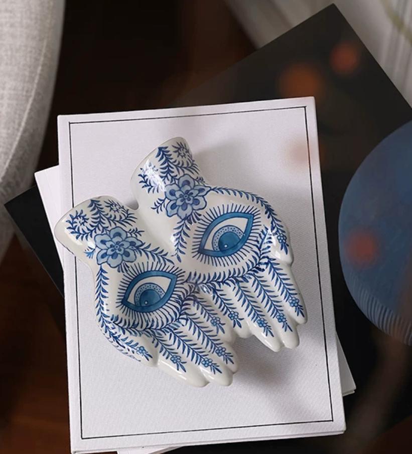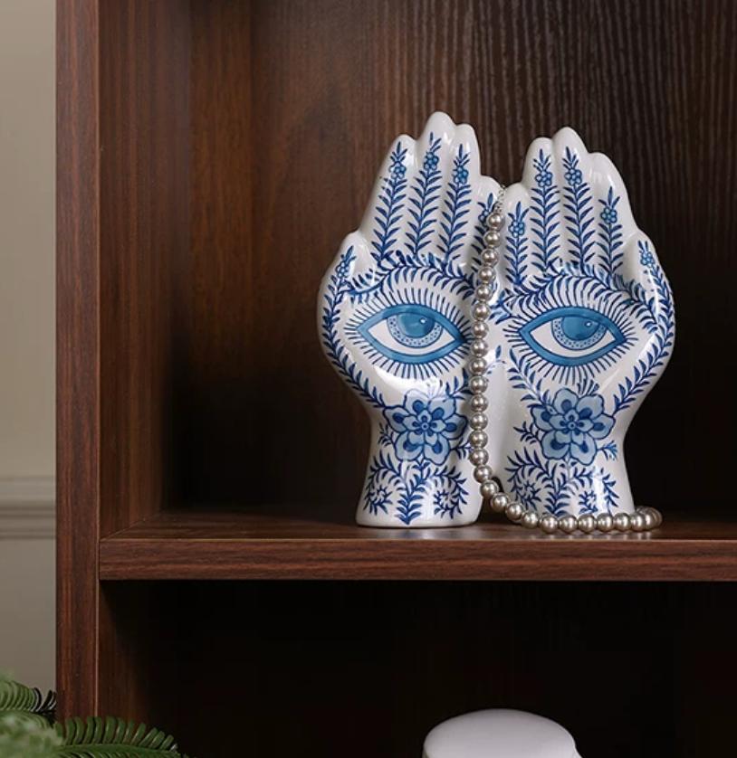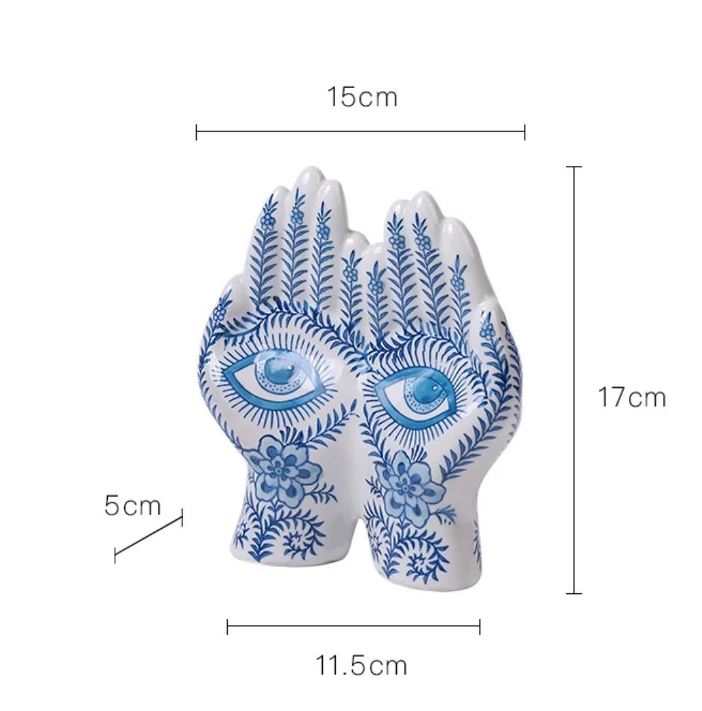 Белый фон ладоней подчеркивает чистоту и невинность, контрастируя с глубиной и загадочностью голубых элементов. Сочетание этих двух цветов создаёт ощущение гармонии и баланса, делая этот предмет декора идеальным дополнением к любому интерьеру, где ценится красота, оригинальность и глубина смысла. Это не просто украшение, это произведение искусства, способное вдохновлять, удивлять и пробуждать воображение.
