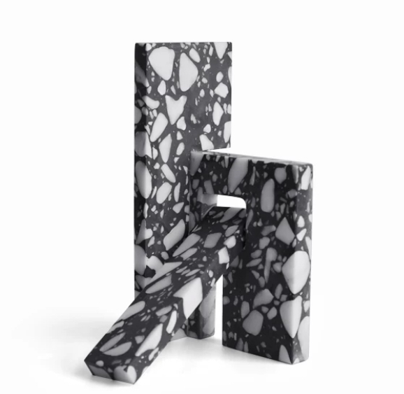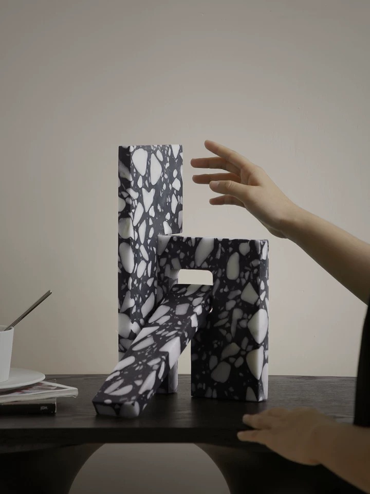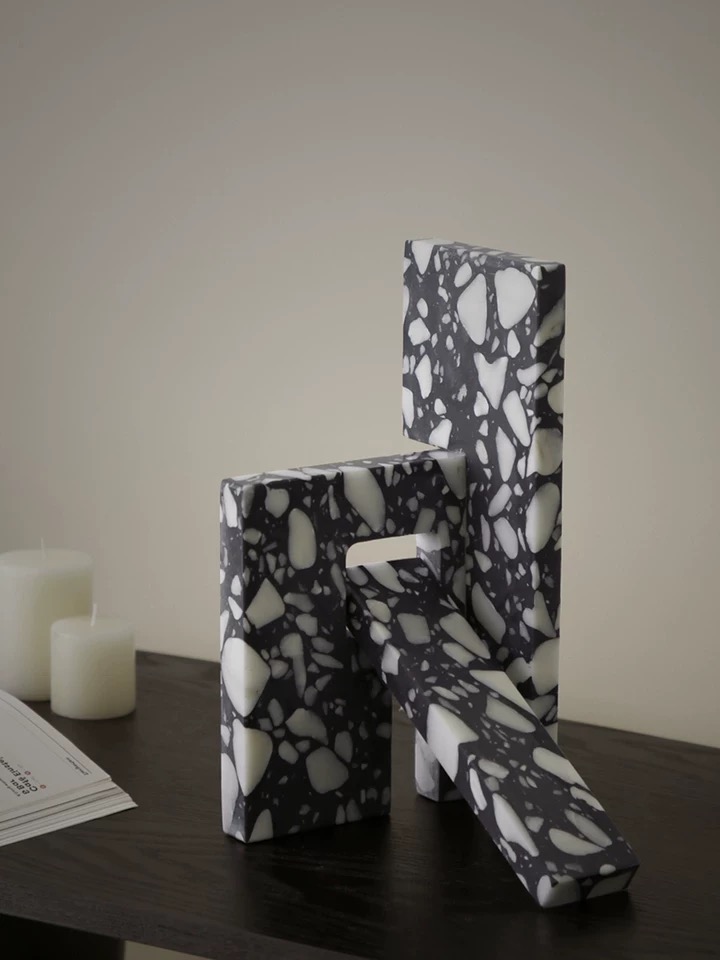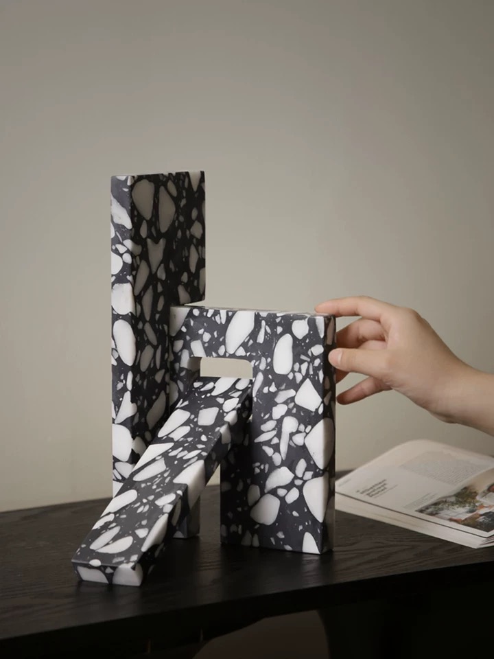 Итак, представьте себе этот прекрасный предмет декора, созданный из тераццо, который представляет собой абстрактную геометрическую композицию, состоящую из серо-белых пластин. Он подарит вашему интерьеру неповторимость, элегантность и стиль, став прекрасным украшением в любом помещении.