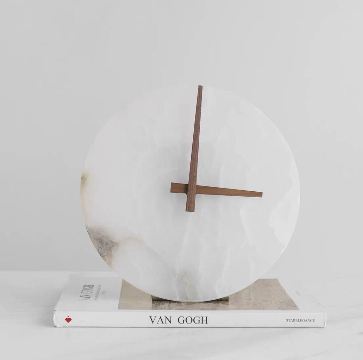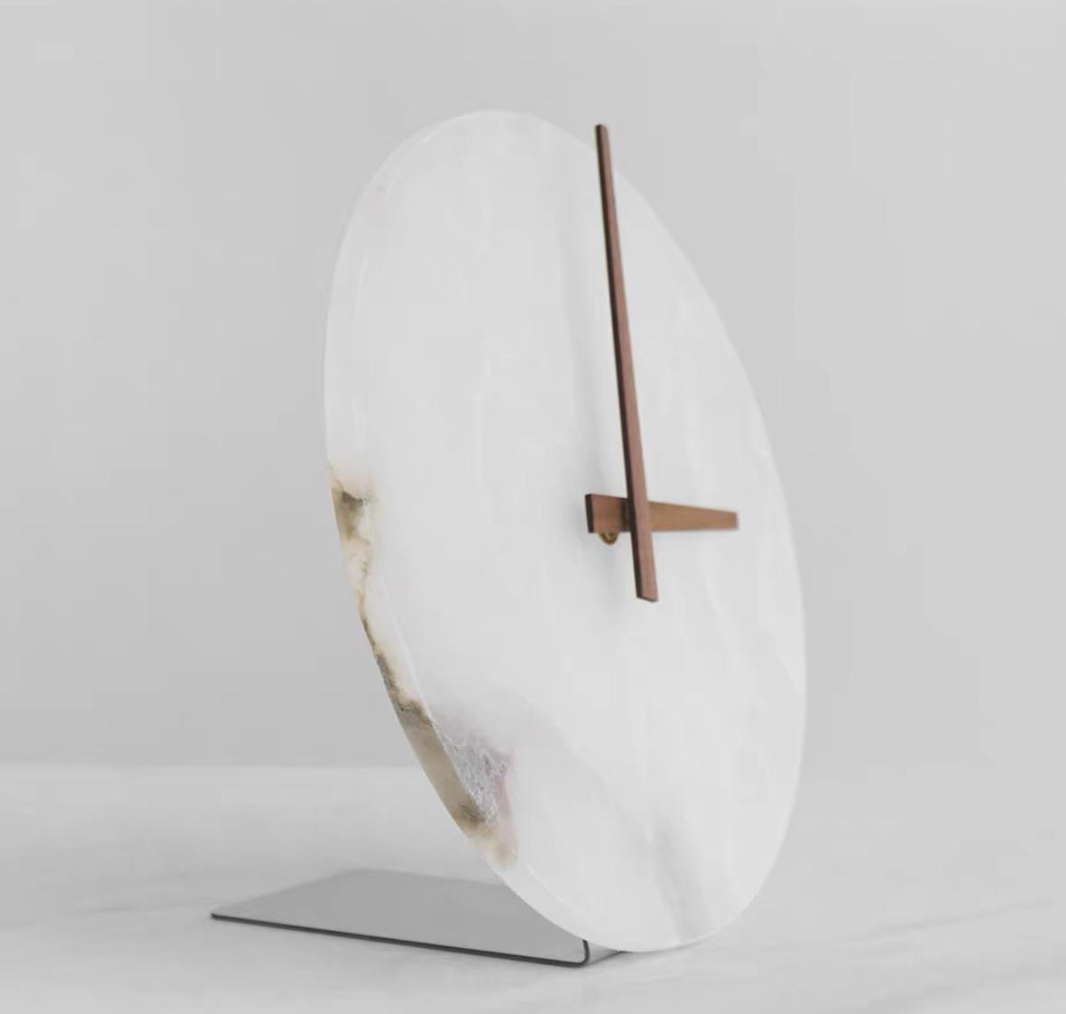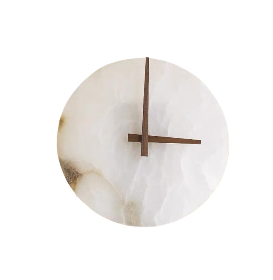 Отсутствие циферблата – смелое решение, подчеркивающее концепцию минимализма. Время определяется по положению двух деревянных стрелок, которые двигаются по гладкой поверхности мрамора. Деревянные стрелки, теплые на ощупь и приятные глазу, являются контрастным элементом по отношению к холодному мрамору и металлу, добавляя в дизайн нотку природной теплоты и уюта.