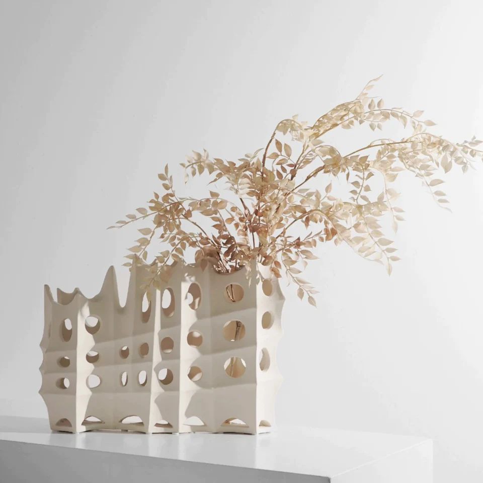 Ровные отверстия по всему периметру вазы и текстура , создают ощущение изысканности и хрупкости. При рассмотрении данного можно найти схожесть со слоновой костью.
