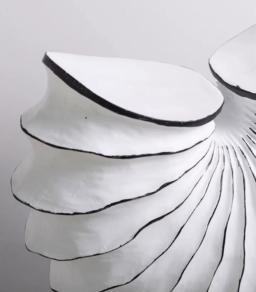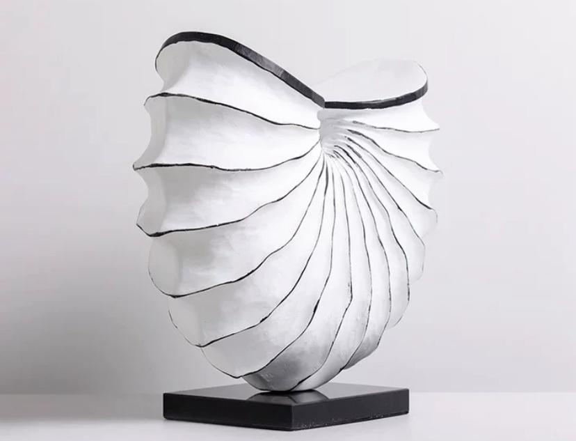 Он может использоваться в качестве акцента на рабочем столе, полке или столике, придающего интерьеру свежести и элегантности. Настольный предмет декора в виде морской раковины белого цвета с прокрашенными черным гранями стильно дополнит оформление пространства в современном минималистичном стиле.