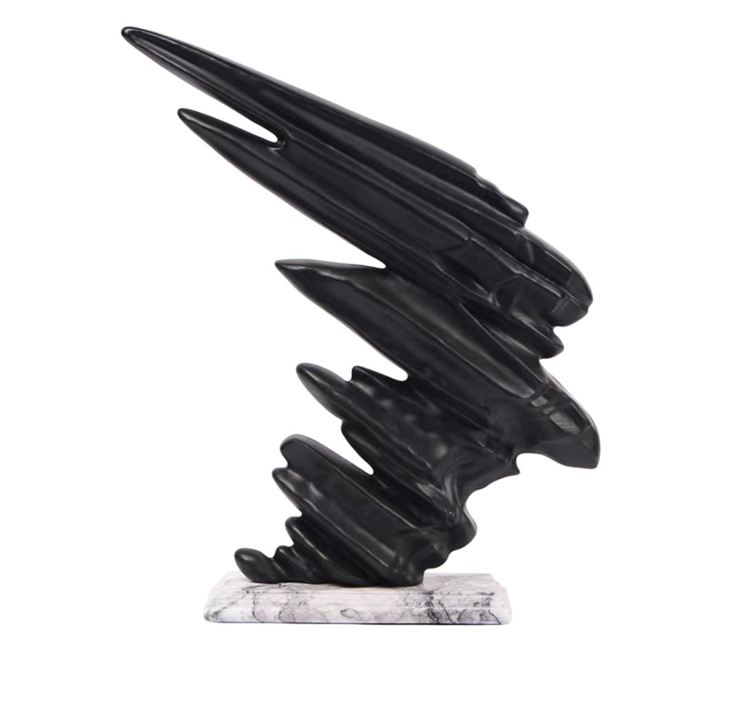 Над каменным основанием возвышается ручная работа из смолы, имитирующая застывший ледяной дождь и сосульки, подхваченные ветром. Горизонтальные линии, словно потоки воздуха, не дают сосулькам упасть, создавая ощущение динамики и напряжения. Каждая тонкая струйка, каждая капля пропитана атмосферой морозного ветра и предвкушения чуда.