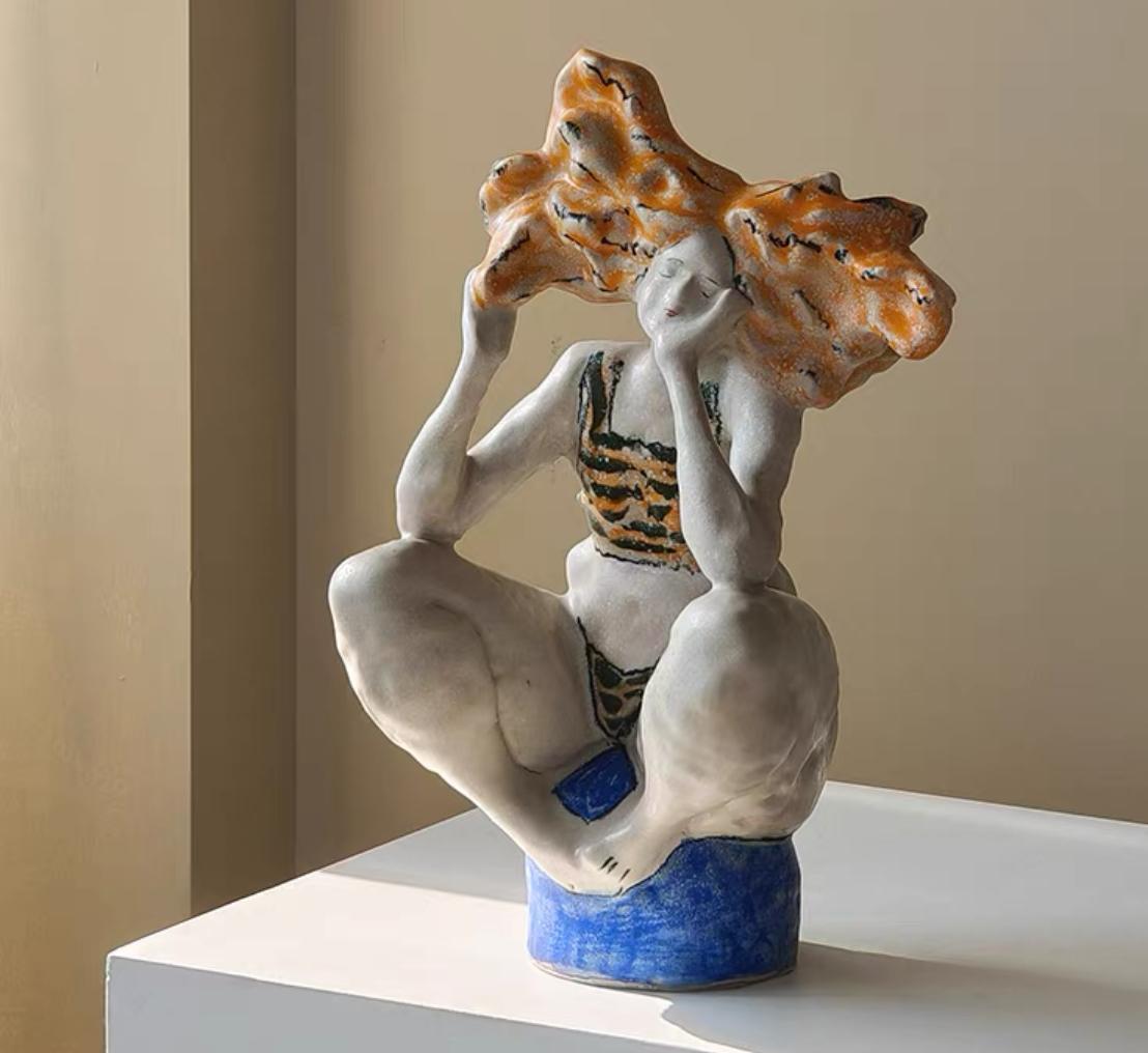 Представьте себе керамическую скульптуру ручной работы, излучающую ощущение покоя и самодостаточности, где акцент сделан на мягких линиях и приятных тактильных ощущениях. Это абстрактное изображение женщины, сидящей в расслабленной позе, возможно, на невидимом пляже или краю бассейна, но суть не в реалистичности, а в передаче настроения.