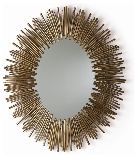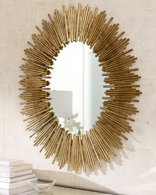 Это невероятно красивое зеркало овальной формы в обрамлении золотых лучей. Такой оригинальный предмет декора добавит в интерьер света и тепла. Это яркое зеркало порадует вас и ваших близких, придаст изюминку вашему интерьеру, наполнит светом пространство! Используйте его как и акцентную деталь и вы заметите, что оно способно заставить вашу комнату сиять!