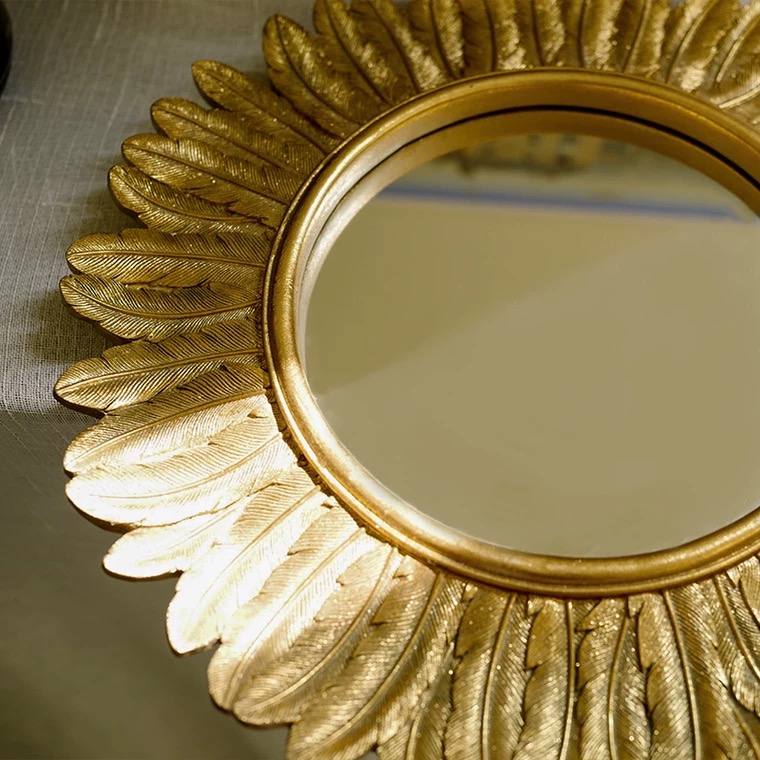 Таким образом, зеркало круглой формы с рамой, созданной вручную из смолы в виде пёрышек и окрашенной позолоченной краской, представляет собой идеальное сочетание красоты, элегантности и загадочности. Этот предмет станет прекрасным украшением любого интерьера и привнесёт в него ощущение роскоши и утончённости.