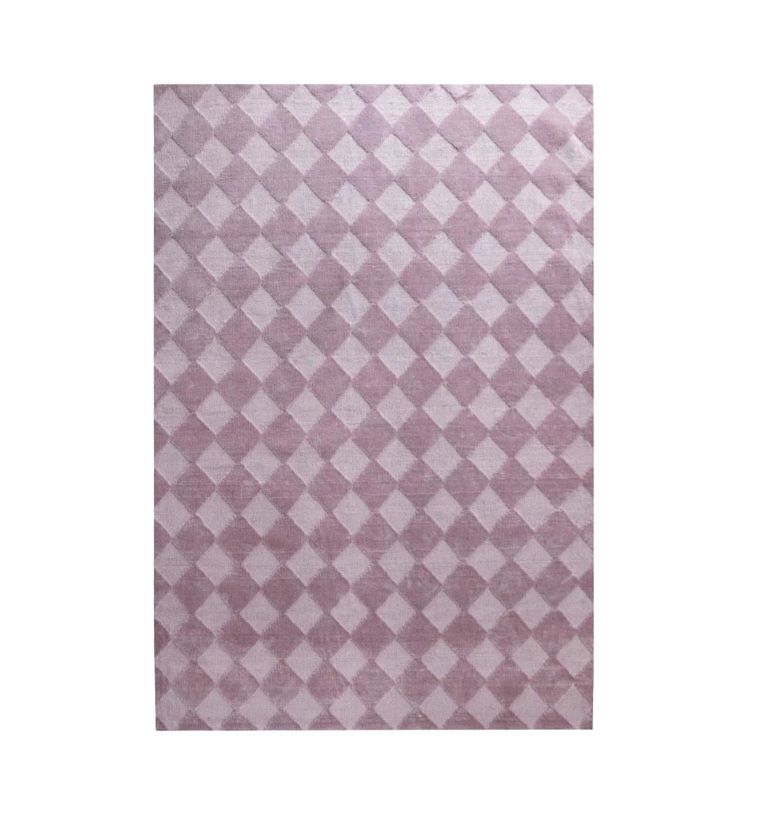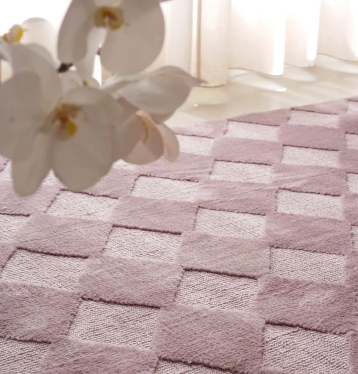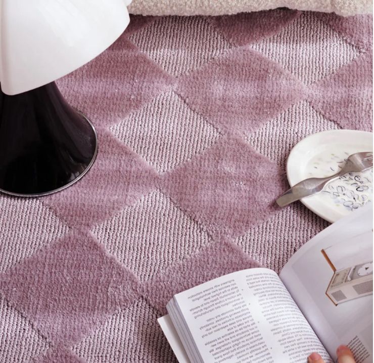 Ковер Berry cream — из шерсти и нейлона, выстриженный ромбиками и окрашенный в цвет ягодного мороженного, выглядит уютно и привлекательно. Шерстяные нити придают ему мягкость и пушистость, а нейлоновые добавляют прочность и стойкость к износу.