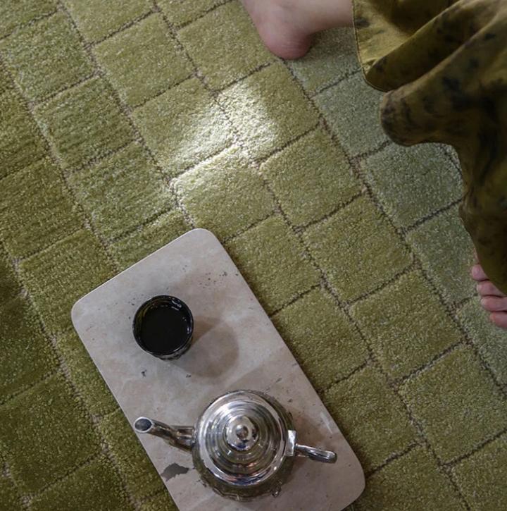 Цветовая гамма ковра начинается с яркого зеленого оттенка на его краях, что символизирует насыщенность цвета на первых признаках весны. По мере приближения к центру ковра, оттенки становятся все более приглушенными, создавая градиентный эффект. Такой эффект добавляет изысканности и глубины ковру, делая его еще более привлекательным для визуального восприятия.