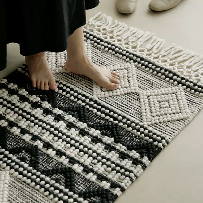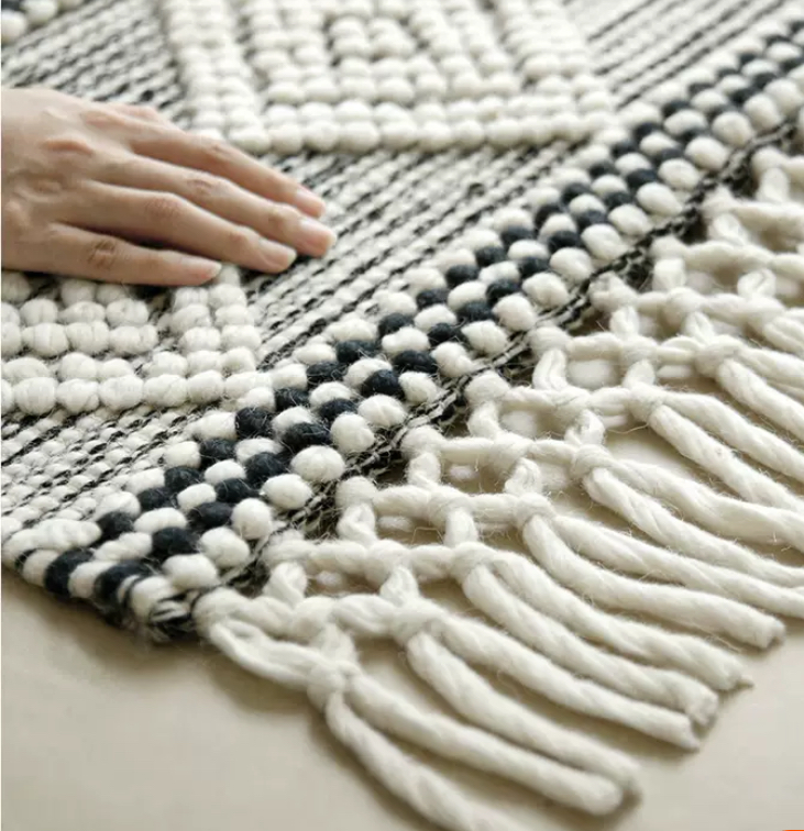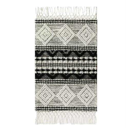 В итоге, данный ковер сливается с интерьером, добавляя ему уюта, тепла и индивидуальности. Высокое качество шерсти и хлопка гарантирует долговечность и удобство использования. Благодаря своим уникальным черно-белым узорам и кисточкам, этот ковер станет неотъемлемой частью вашего дома или офиса. Не упустите возможность приобрести этот оригинальный и стильный предмет интерьера!